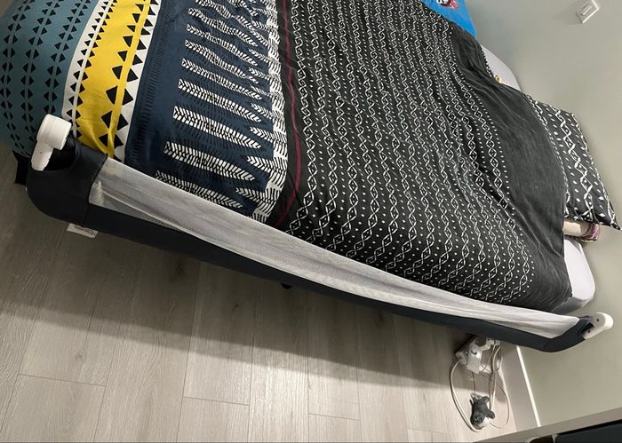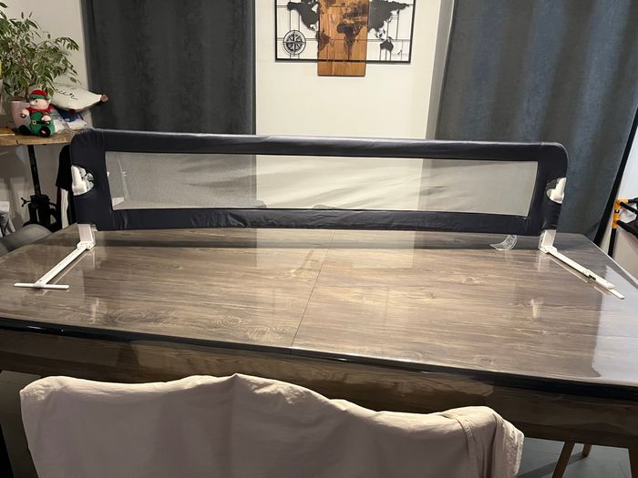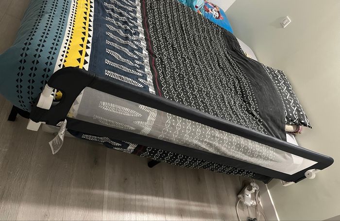 Barriere de lit de la marque vidaXL couleur grise 180x42cm Se rabat pour pouvoir coucher l’enfant. Si vous n’avez qu’un sommier et pas de tour de lit pour maintenir la barriere, il y a des trous pour la visser aux lattes. Se demonte facilement pour etre transportée Jamais utilisée