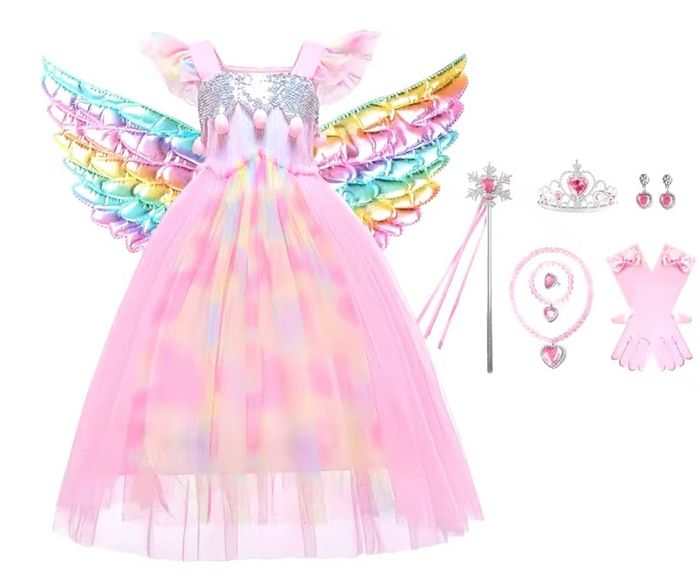 Déguisement robe princesse licorne et ces accessoires (couronne, baguette, gants, bijoux, aile). 3 tailles disponibles : - 3-4ans : longueur de la robe 80cm, - 5-6ans : longueur de la robe 90cm, - 7-8ans : longueur de la robe 100cm, Vendu dans leur pochette d’emballage d’origine, idéal pour faire un cadeau ! Expédition rapide après votre commande.