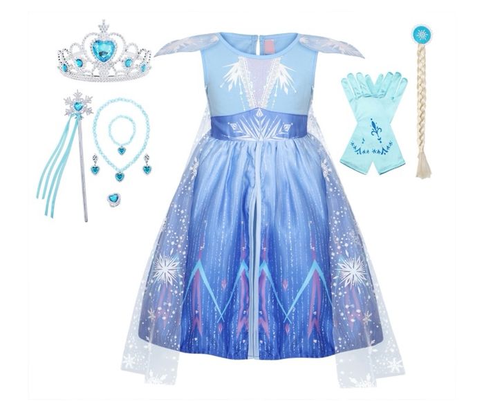 Déguisement Robe de princesse Elsa la reine des neiges et ces accessoires (couronne, baguette, gants, bijoux, tresse). 1 taille disponible : - 3-4 ans : longueur de la robe 65cm, Vendu dans leur pochette d’emballage d’origine, idéal pour faire un cadeau ! Expédition rapide après votre commande.