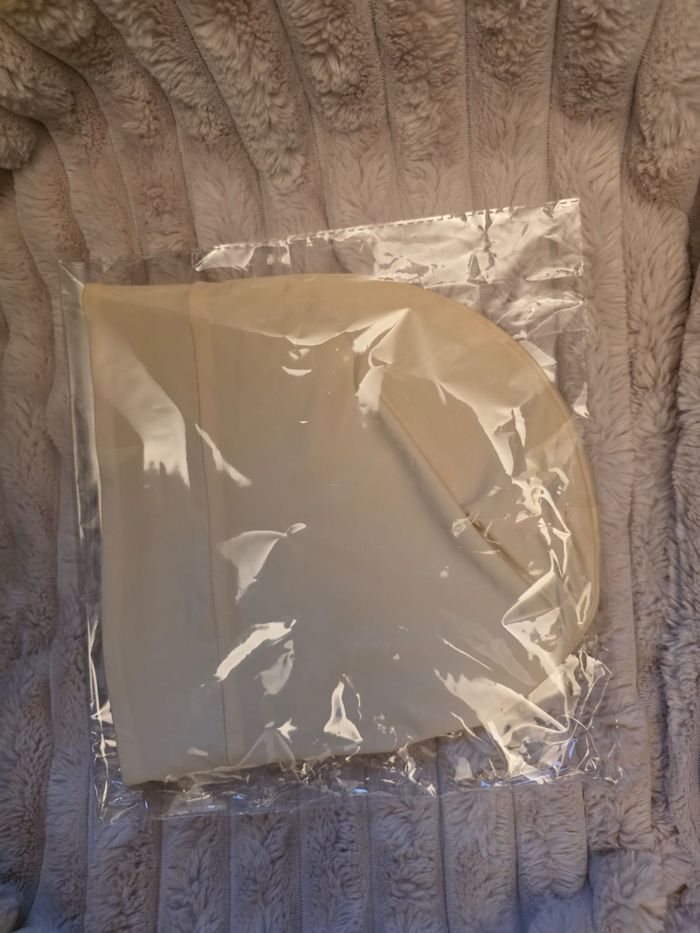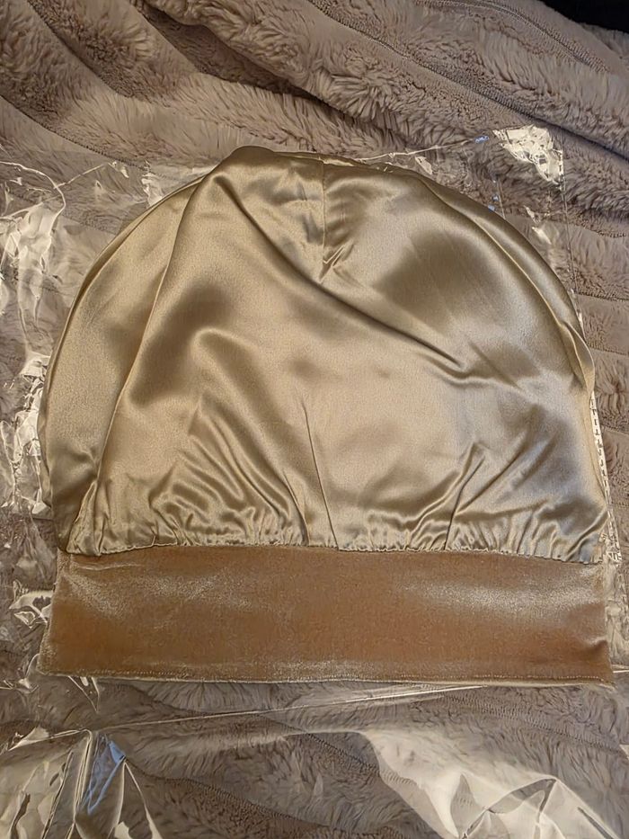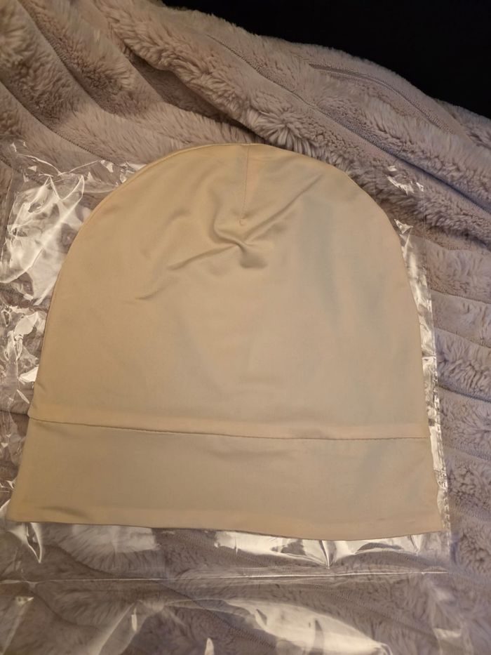Bonnet sous voile couleur crème, intérieur soie de murier et extérieur soie de lait. Bande en velours anti-dérapante. Trou pour lunettes. Neuf, jamais porté.