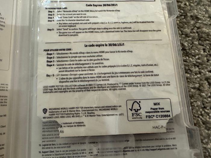 Jeu avec code, ne contient pas de carte comme indiqué sur la boîte. Le code est sur le papier que j’ai plastifié car il est abîmé. Malgré ça le code est bien lisibles et le jeu est valable jusqu’au 30/06/2031. #jeunintendoswitch #harrypotter #lego #nintendoswitch #jeuharrypotter