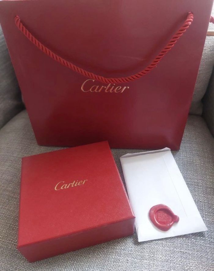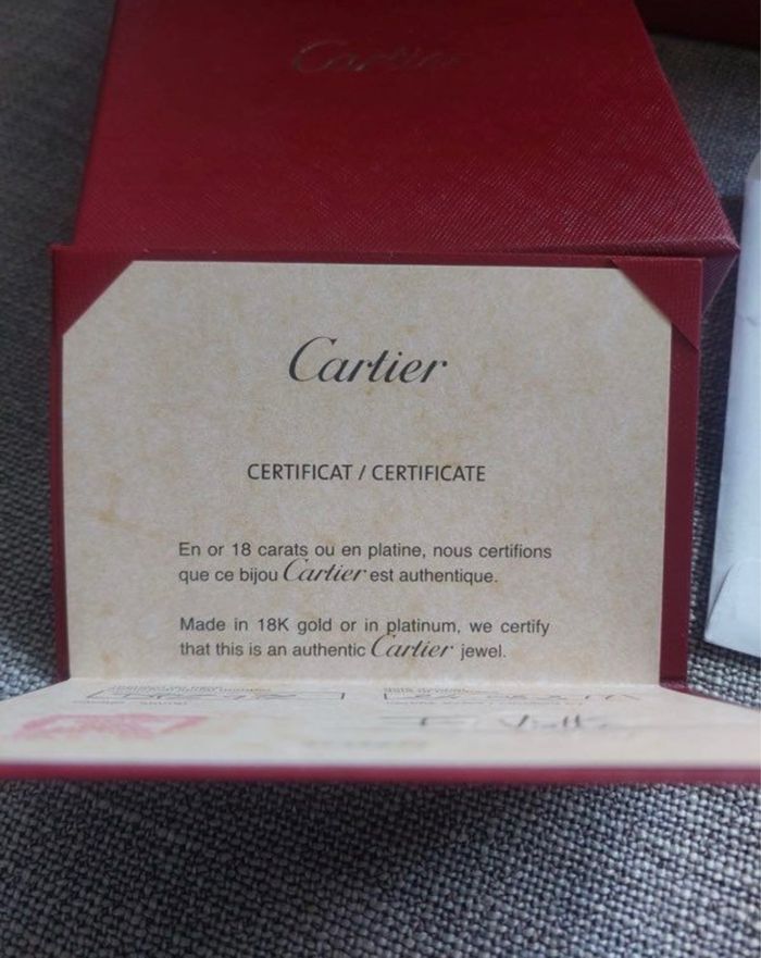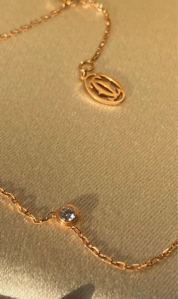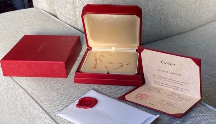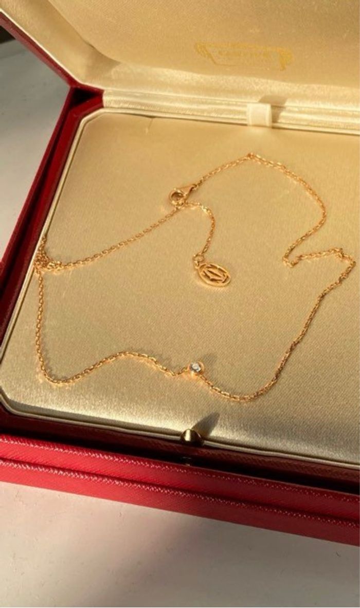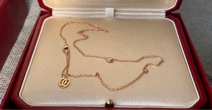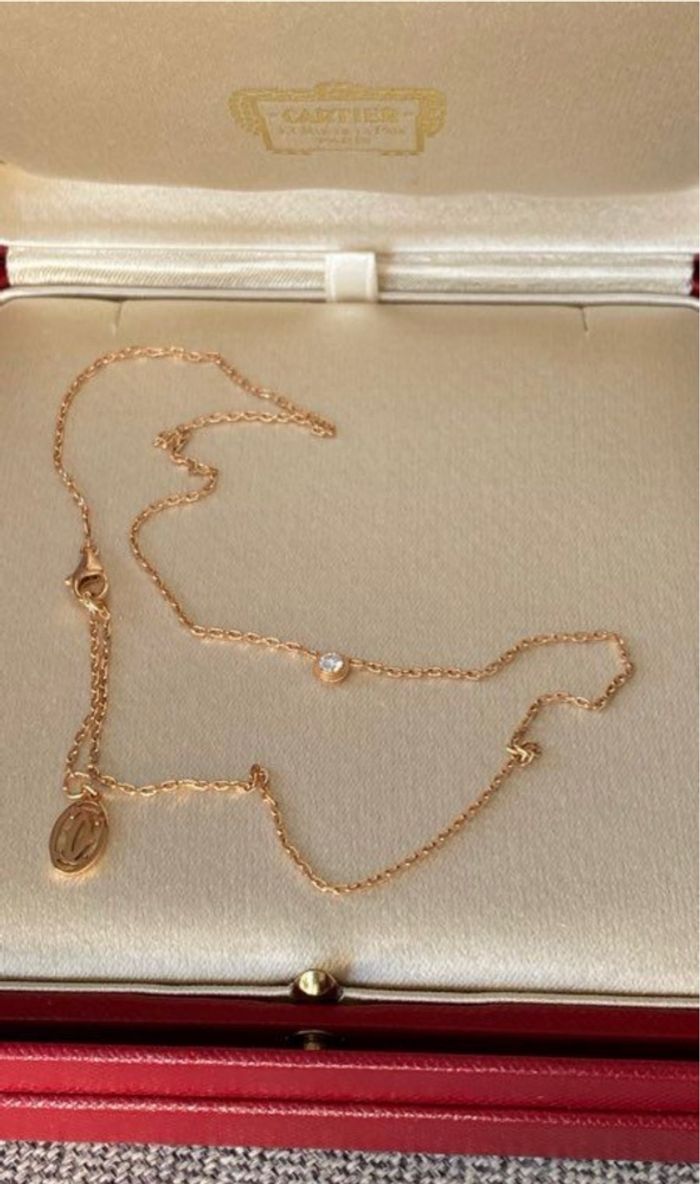 État: neuf, cadeau jamais porté et resté dans sa boîte d'origine depuis l'achat . Date et lieux d'achat: Août 2017 chez Cartier rue de la Paix à Paris. Boîte d'origine avec papiers ainsi que la facture d’achat sous pochette cartonnée. Avec son sac d’achat Cartier. Description détaillé du bijoux : Collier en or rose 18 carats (750/1000) serti d'un diamant naturel taille brillant pour 0,09 carat. La chaîne est ajustable allant de 38 à 41 cm