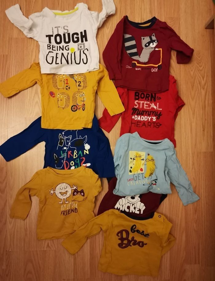 Lot de 14 vêtements garçon 9 mois composé de t shirt manches longues, gilet sans manche et 2 pulls épaisseur. Pas de tâche et ni de trou.