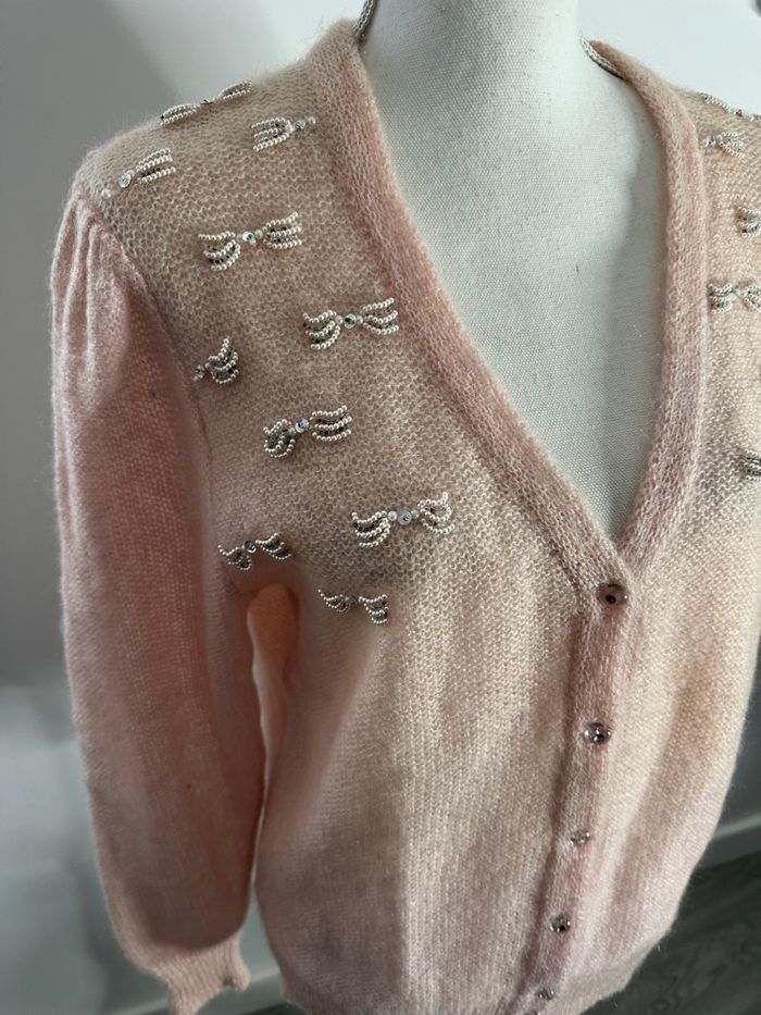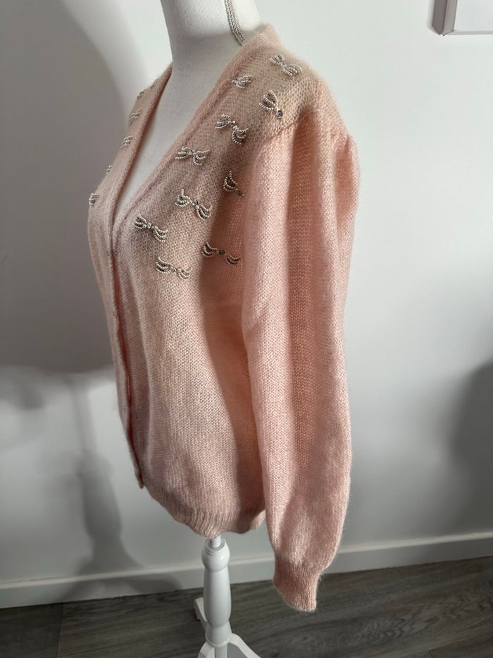 Cardigan rose poudré en kid mohair et perles Vintage T42 XL - photo numéro 2