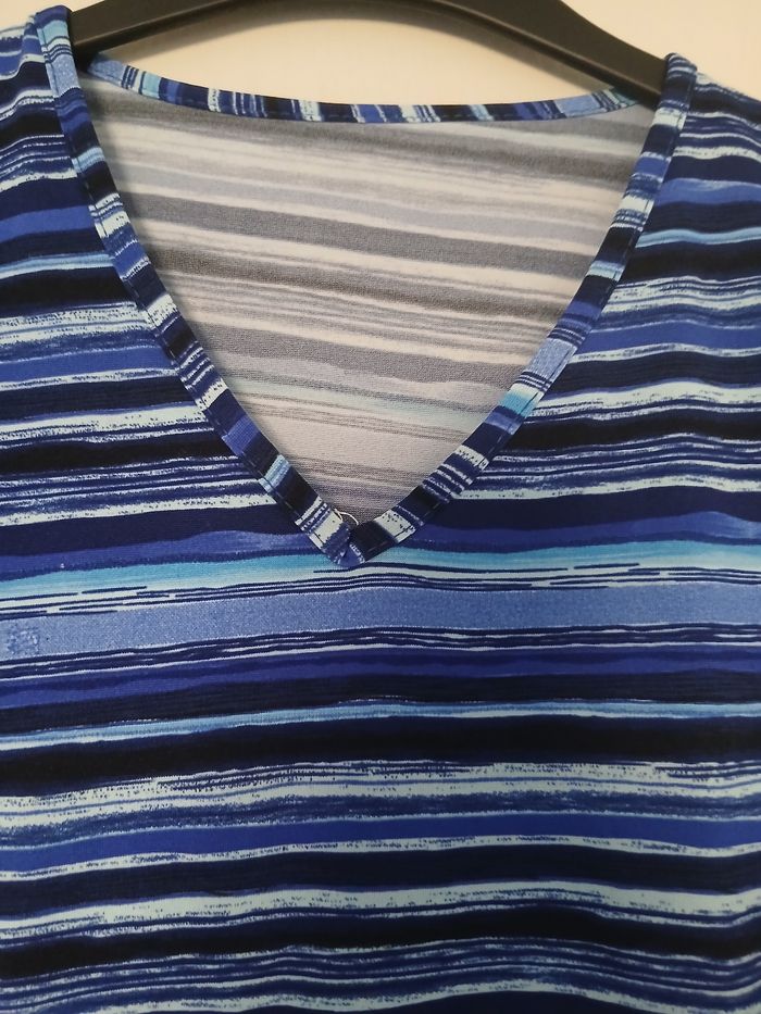 Tee shirt bleu rayé en viscose et lycra. 36 cm de largeur des épaules 38 cm de largeur des aisselles 49 cm de longueur