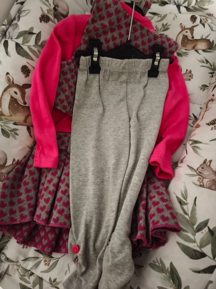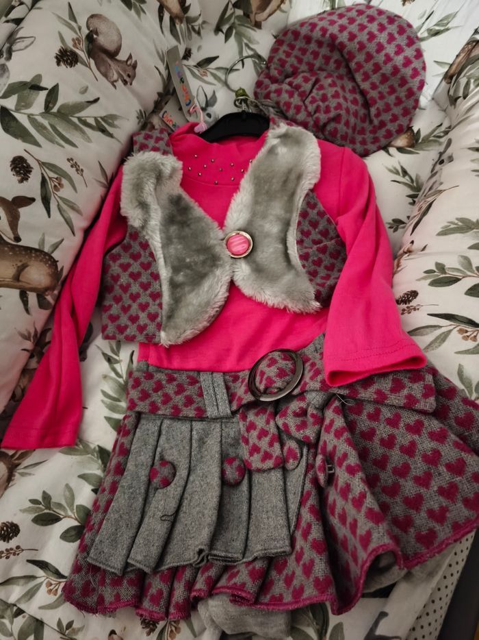 Magnifique ensemble pour petite fille : Robe rose et grise motif cœurs, gilet imitation fourrure, leggings assorti et bonnet 🥰 📏 Taille : 18 mois 📦 État : très bon état ❄️ Parfait pour l’hiver / automne