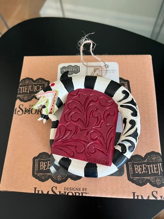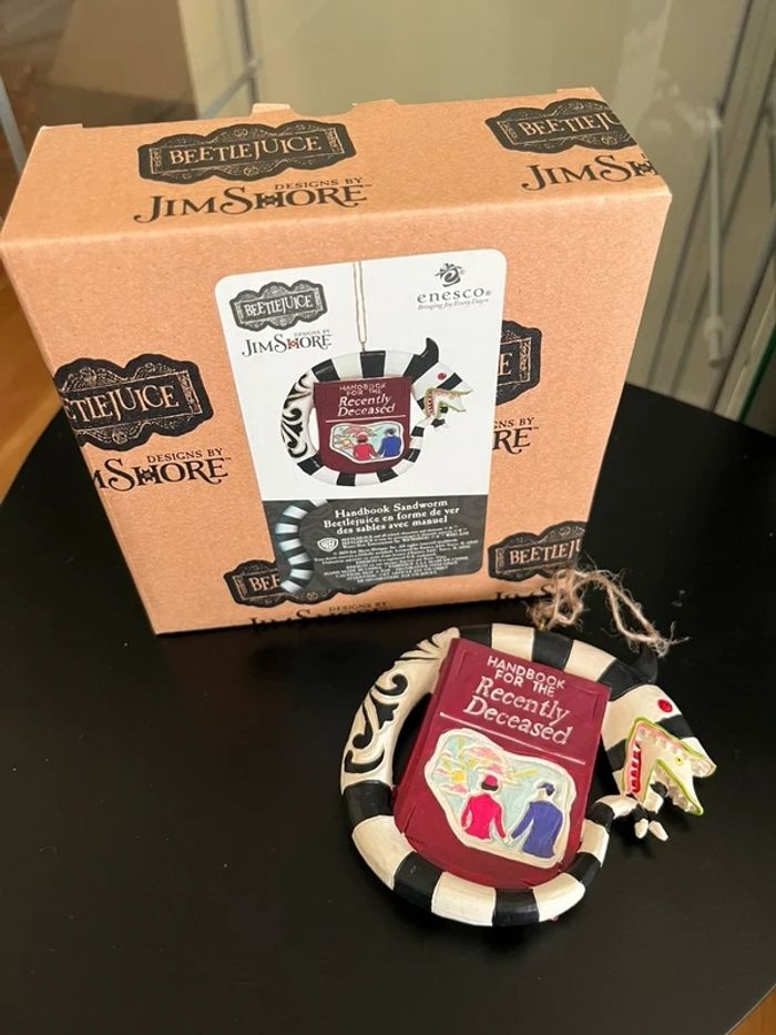 Ornement suspendu inspiré de Beetlejuice avec le ver des sables entourant le « Manuel pour les Récemment Décédés » -Dimensions : 9,6 cm de haut x 2 cm de large x 10,2 cm de long. -Design artistique de la collection Beetlejuice de Jim Shore • Peint à la main et fabriqué en résine de pierre de haute qualité