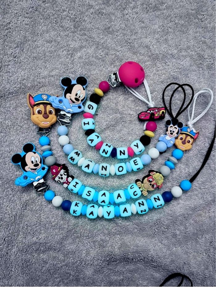 Pour passer la commande il suffit de valider le paiement sur l'annonce du modele désiré et de m'envoyez le prénom de l'enfant par message que je puisse réaliser votre commande. A partir de 2 articles vous bénéficiez de 5% de réduction. Réalisation dans la journée l'adaptateur tétine mam et en supplément à 1€ Si vous souhaitez quelque chose en particulier n’hésitez pas à m’envoyer un message qu’on voit ça ensemble 🥰 Une photo peut être envoyé avant l’envoi bien sûr ☺️
