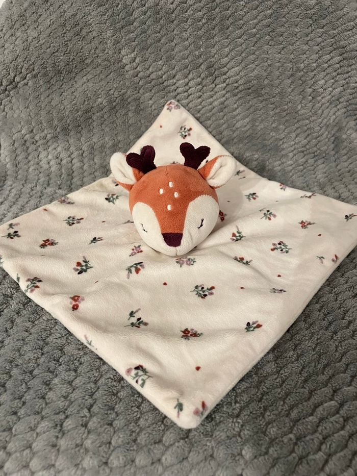 Doudou plat Biche Faon Cerf Renne blanc beige marron fleurs Simba Toys Kiabi - photo numéro 1