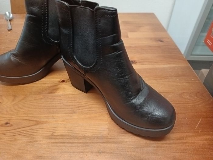 Bottine en cuir en très bon état très peu portée. Taille 37. Hauteur talon 7 cm et hauteur semelle 1,5 cm. A bientôt