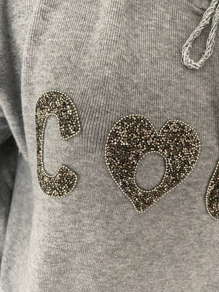 Sweat gris à capuche gris Avec inscription « Coco » avec perles , les lettres O de coco sont en formes de cœur Lien de serrage de la capuche de couleur gris et argenté Taille s/m Article neuf Jamais porté