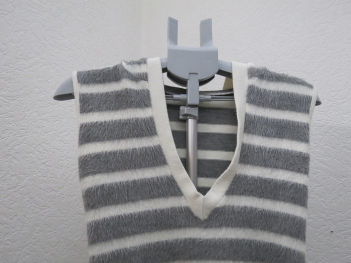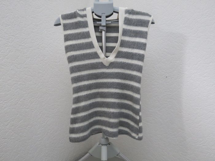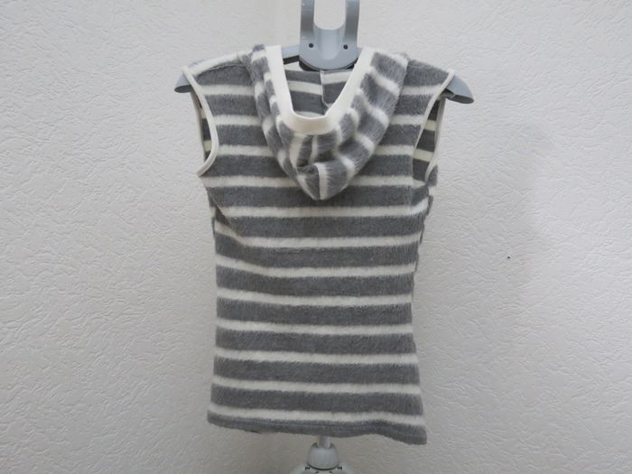 Débardeur sans manches rayé gris et blanc, matière ultra douce et moelleuse (effet laine/polaire). Coupe droite, encolure en V à l’avant et petite capuche à l’arrière pour un style casual cosy. Idéal en superposition ou porté seul à la mi-saison 🤍 Très bon état, aucune tache ni défaut. 📏 mesures à plat Aisselle à aisselle : 40 cm Longueur : 62 cm TAILLE : 36 Convient pour un style décontracté, cosy, minimal ou street chill. N’hésite pas si tu as des questions ✨