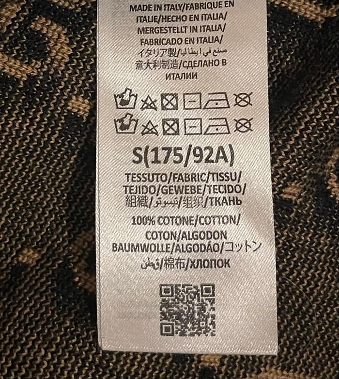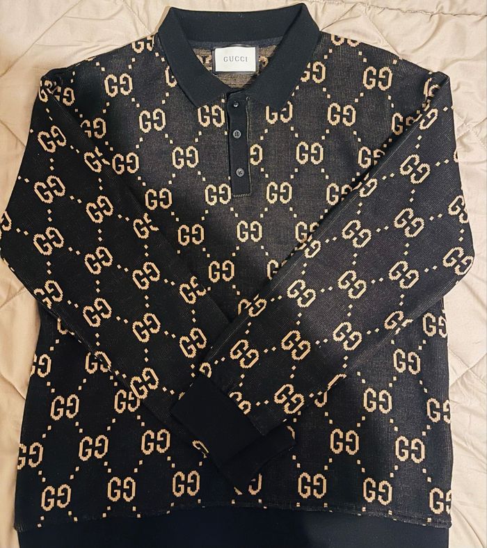 Magnifique pull Gucci à manches longues et col polo, orné du célèbre motif monogramme "GG" en maille jacquard sur l'ensemble du vêtement. Une pièce forte, élégante et très confortable. • Marque : Gucci (Authentique) • Couleur : Noir avec motif GG beige/doré. • Taille : XL • Matière : Maille 100% Coton épais de qualité supérieure. • Fabrication : Made in Italy. • État : Comme neuf • Détails : Finitions bord-côte aux poignets et à la taille. Boutons discrets et élégants. Étiquette avec QR code présente pour vérification. Envoi rapide et soigné.