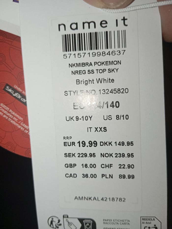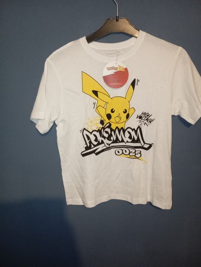 Vends t-shirt blanc pour enfant de la marque name it, sous licence officielle Pokémon. L'article est neuf avec étiquette. ​Le design représente Pikachu avec un style "graffiti" et l'inscription "High Voltage". ​Marque : name it ​Couleur : Bright White (Blanc éclatant) ​Taille : 9-10 ans (correspond à du 134-140 cm) ​État : Neuf avec étiquette ​Référence style : 13245820 ​Prix d'origine : 19,99 € ​Idéal pour un cadeau ou pour un jeune fan de l'univers Pokémon.