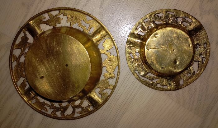 Ensemble de 2 cendriers en métal doré (peut-être en laiton, mais je n'y connais rien) avec contour en feuillages très jolis Provient d'un héritage, à renettoyer Très bon état général