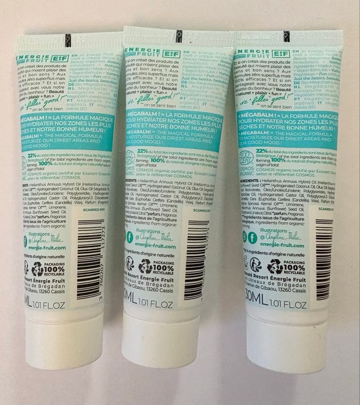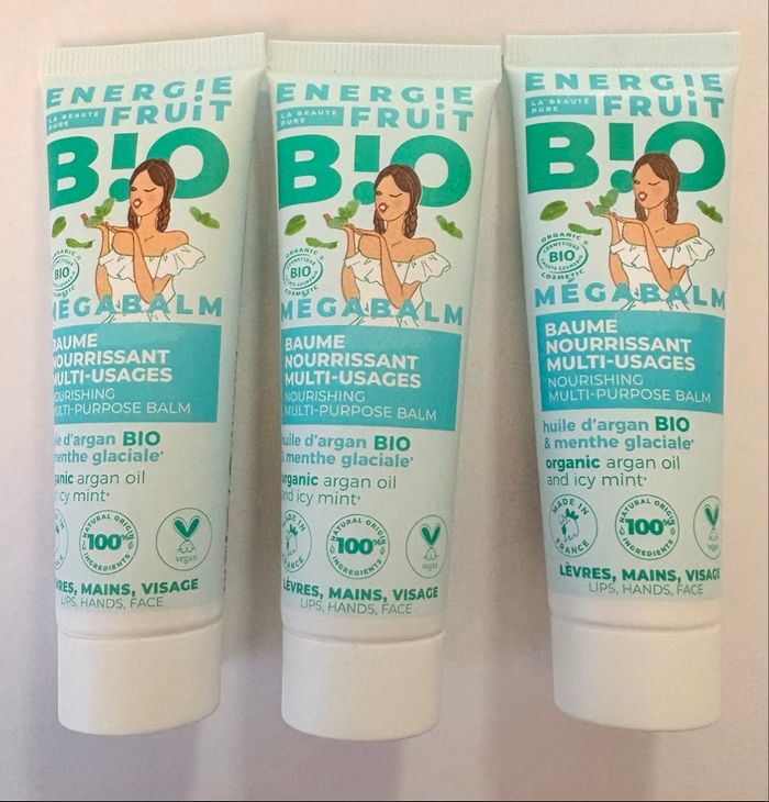 lot de 3 tubes neufs (30ml chacun) de Mégabaume nourrissant multi-usages. Un indispensable ultra-frais et 100% naturel ! • Multi-usages : Idéal pour les lèvres gercées, les mains sèches, le visage ou même les petites zones rugueuses (coudes, cuticules). • Sensation Menthe Glaciale : Offre un effet vivifiant et rafraîchissant immédiat. • Composition Nickel : 100% d'origine naturelle, certifié BIO (Ecocert) et Vegan. • Made in France : Fabriqué avec amour en Provence (Cassis). État : Neufs, jamais ouverts. Format : 3 x 30ml (parfait pour glisser dans le sac ou pour voyager).
