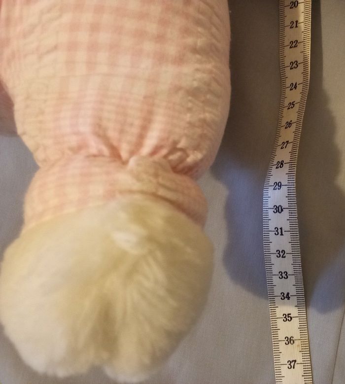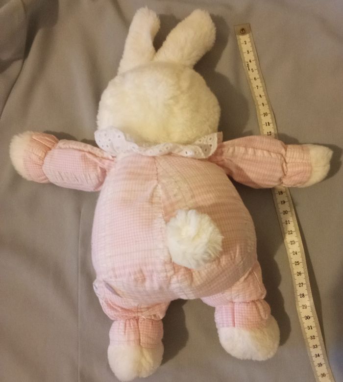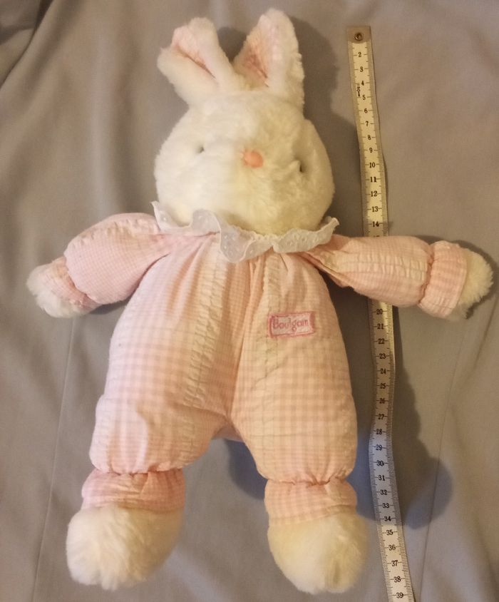Son prix est de 65€ hors port Doudou peluche lapin blanc et rose clair de la marque Boulgom doudou vintage ancien corps tissu rose clair imprimé de traits lignes carreaux carrés un peu de vichy rose très bon état d'occasion peu utilisé il a encore son étiquette cousue très lisible lapin nez rose en dur style plastique yeux plastique noir sûrement fabriqué en Haute Savoie chez Vulli son état est magnifique pas de tache pas de trou pas d'usure il est en posture debout et il mesure environ 36 cm de haut regarder la photo avec sa dimension fausse fourrure blanche / blanc et tissu blanc et rosr clair lapine Boulgom retro retrouvez le doudou de votre enfant de votre enfance Doudou est propre prêt à être utilisé