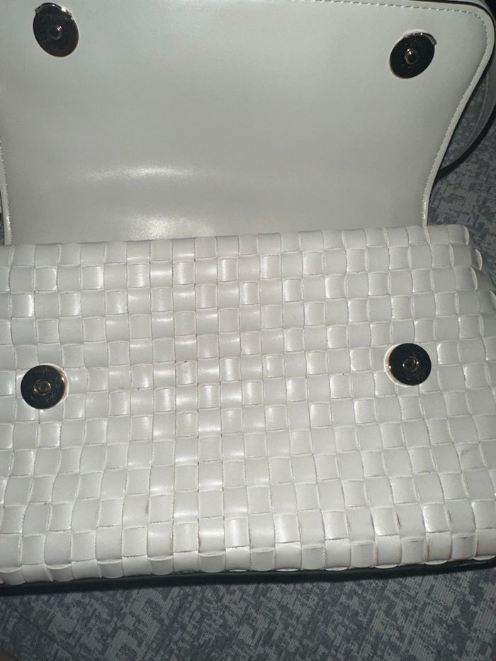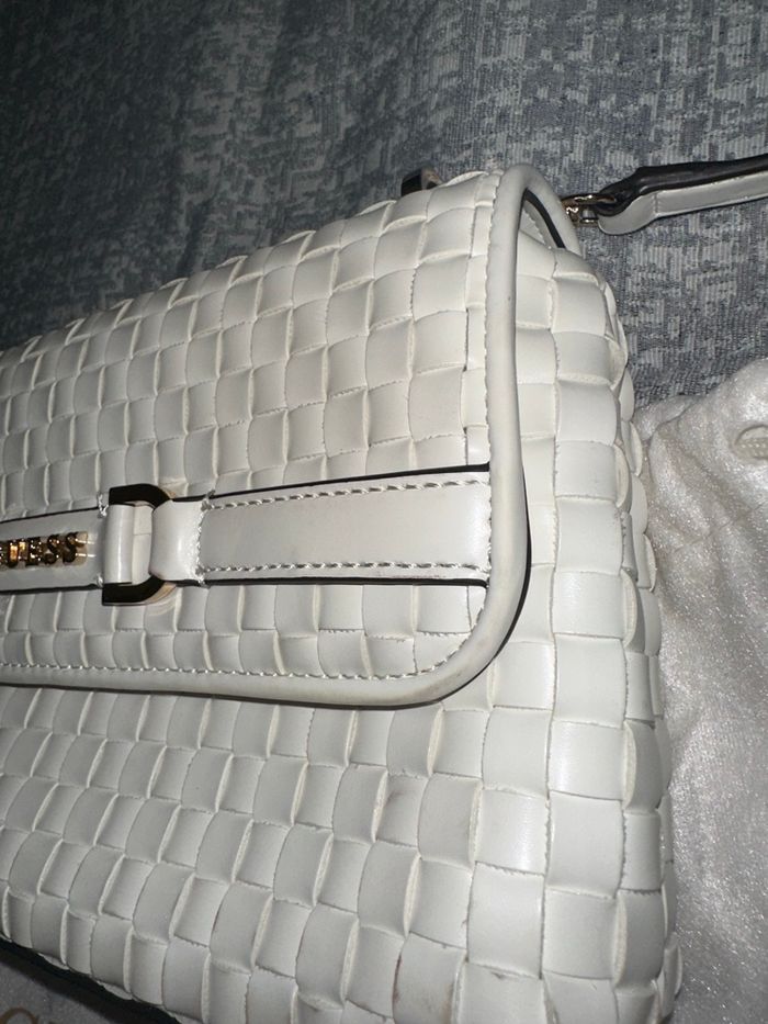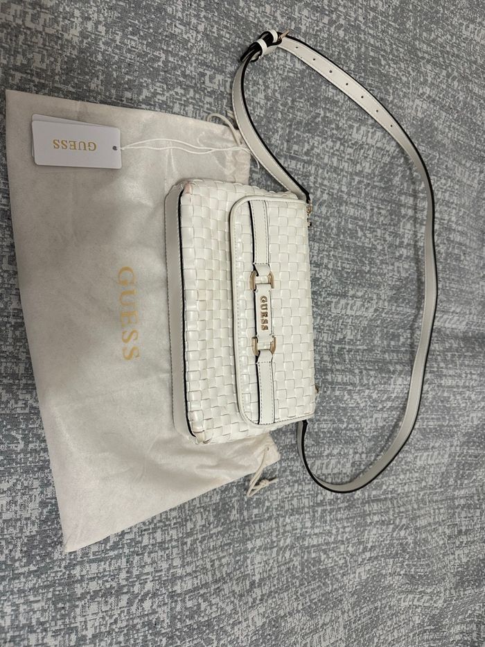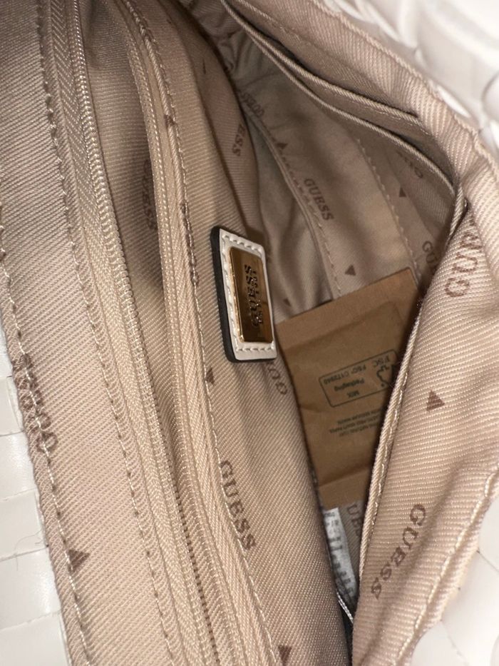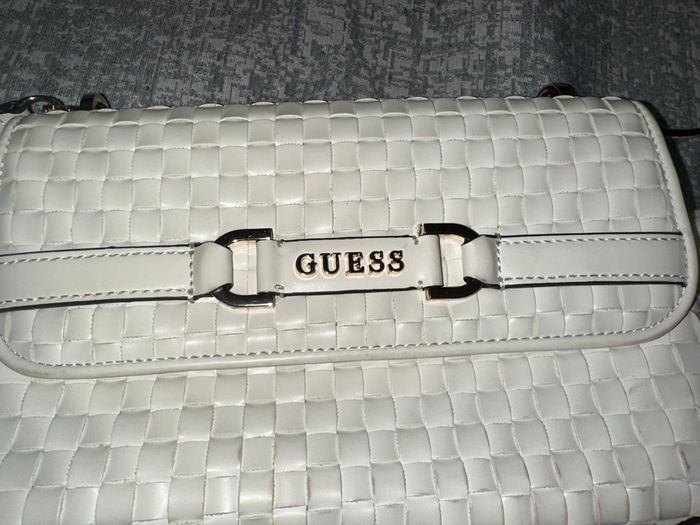 Sac à épaule bandoulière Guess blanc, acheté en boutique officielle Guess. Dimensions : largeur env. 25 cm, hauteur env. 15 cm, profondeur env. 4,5 cm Poids : env. 480 g Couleur : White (blanc) 1 bandoulière de sécurité réglable, amovible : env. 100 cm - 117 cm Modèle élégant et intemporel. Quelques taches visibles à l’extérieur, susceptibles d’être nettoyées (voir photos). Intérieur impeccable, propre et comme neuf. Vendu sans carton d’origine, tel que présenté sur les photos. Facture d’achat disponible pour authentification.