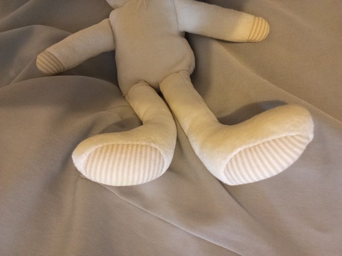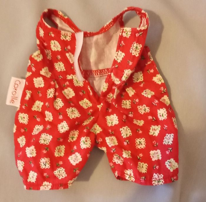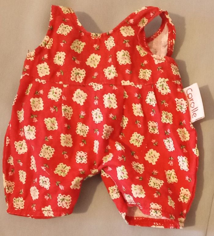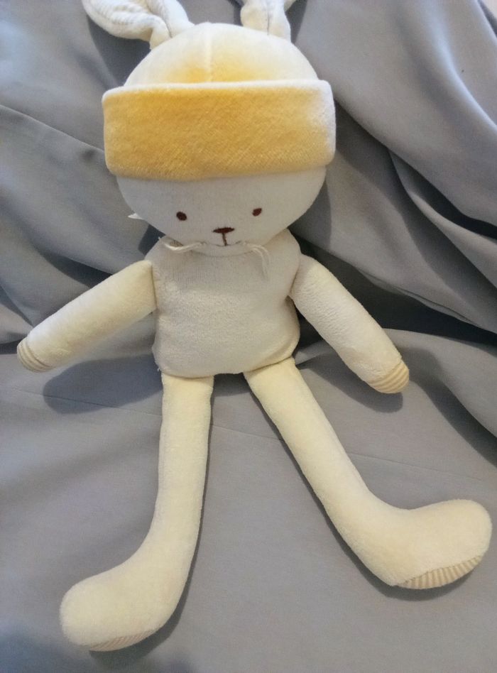 PRIX 55€ HORS PORT doudou peluche lapin blanc blanc-cassé crème bonnet jaune de la marque Corolle il est de l'an 2000 et sa référence est 00203 chez Corolle Son nom c'est Zouzou il est d'occasion propre , complet vendu avec sa salopette rouge son corps fait 30 cm 12" sans compter les oreilles je pense qu'il existe en une seule taille la salopette rouge est imprimée de fleurs de roses , des roses de couleur rose dessous des pattes rayé rayures main tissu rayé yeux nez bouche brodé il a des petites moustaches en fil ficelle doudou est encore joli modèle difficile à trouver mes envois sont sécurisés et filmés