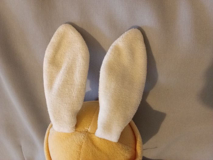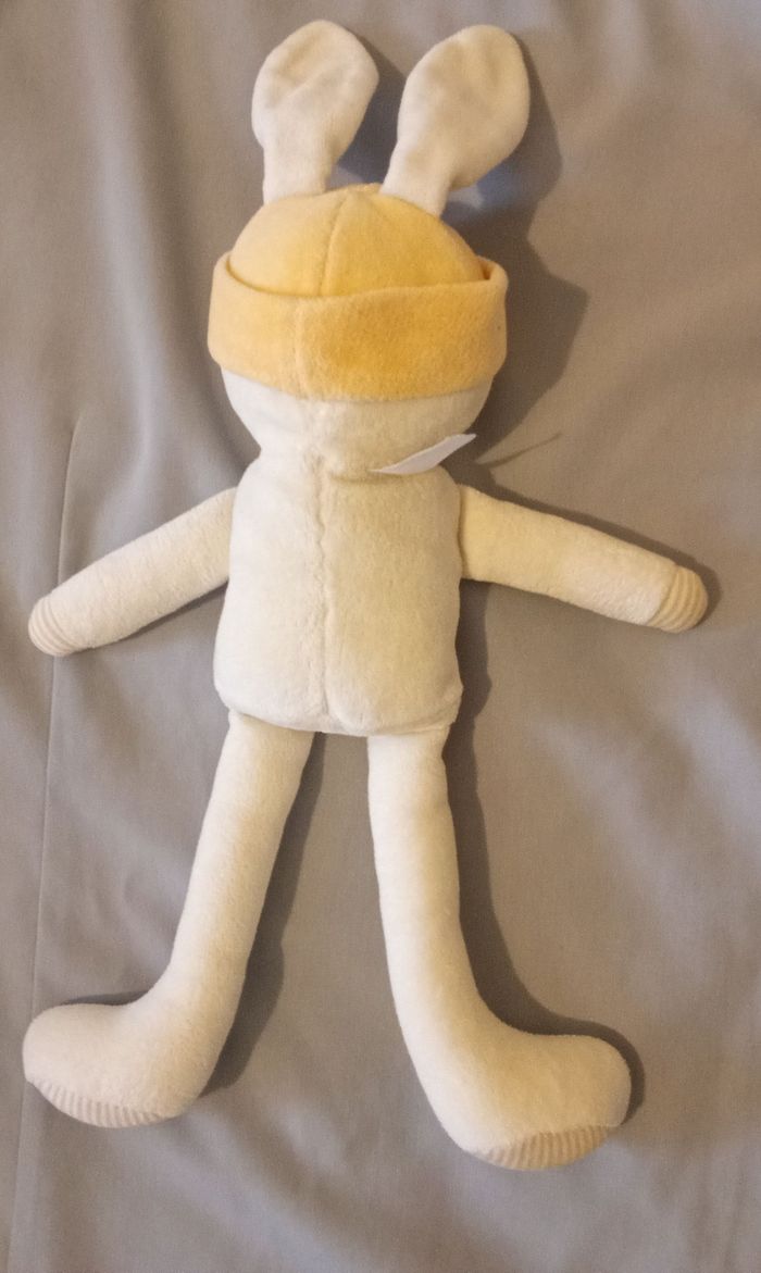 doudou peluche lapin de la marque Corolle de 2000 Zouzou corps 30 cm sans les oreilles  ref 00203 blanc crème bonnet jaune salopette rouge d'occasion - photo numéro 8