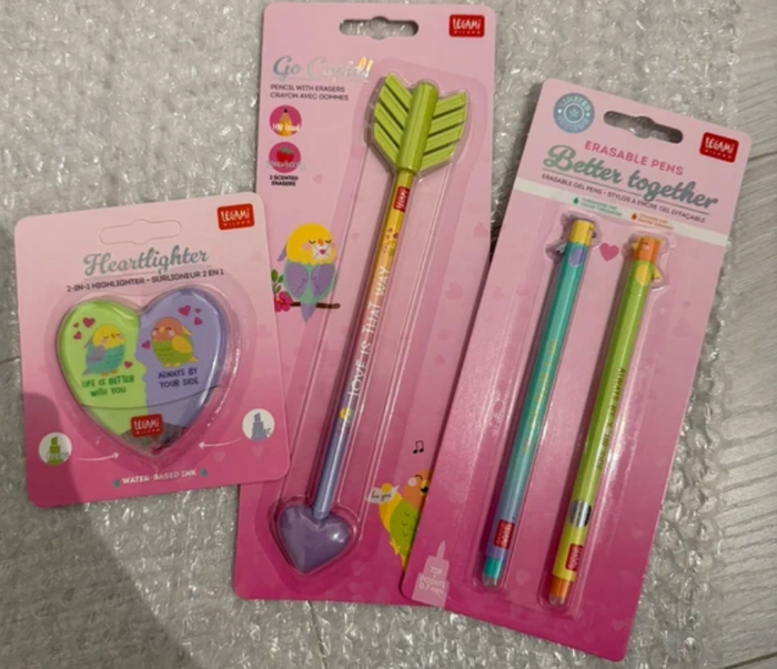 Je vends plusieurs articles neufs de la collection Legami Saint-Valentin 2026. • Lot de 2 stylos effaçables et rechargeables Legami Encre turquoise et orange, pointe 0,7 mm, écriture fluide et effaçable. • Surligneur 2 en 1 – Heartlighter Couleurs vert et lilas, pratique et original. • Crayon avec deux gommes parfumées – Go Cupid! Neuf. #legami #legamimilano #saintvalentin #saintvalentin2026