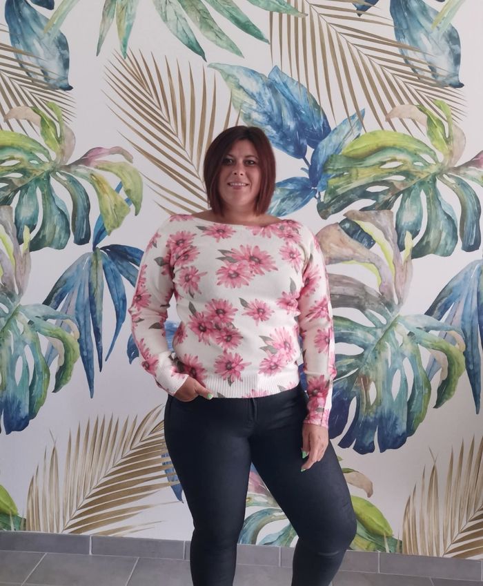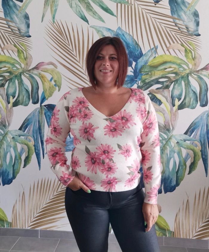 Jolie pull avec fleurs rose peut se mettre des deux sens. Taille unique 36-42 🚨Promo au lieu de 29€90