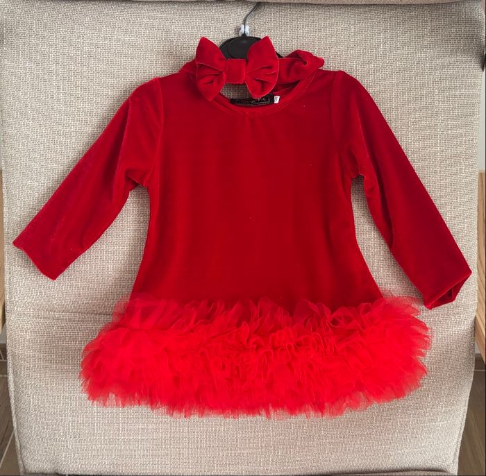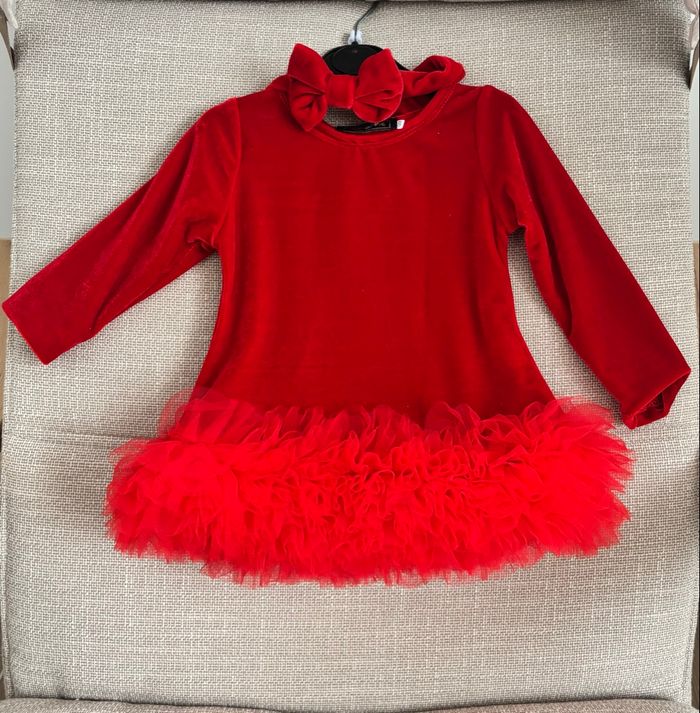 Robe de fêtes bébé fille Rouge velours avec le bas de robe en tulle Vendue avec le bandeau assorti Taille 12 mois Portée 1 fois