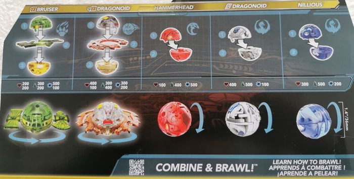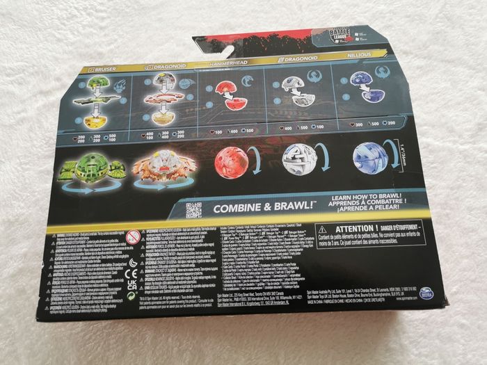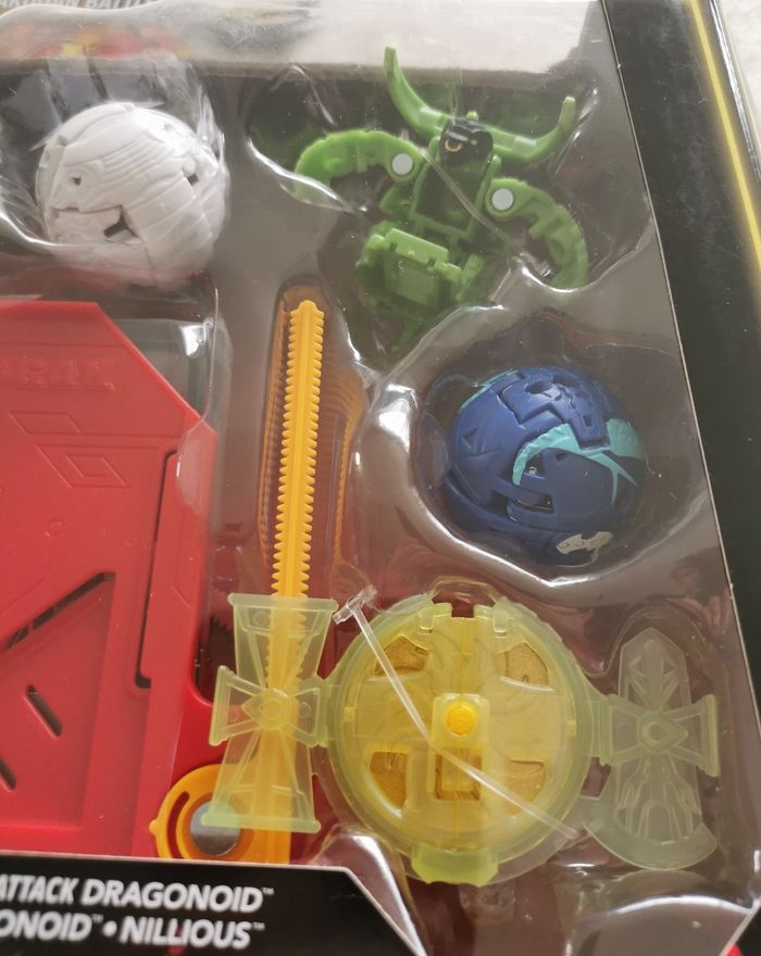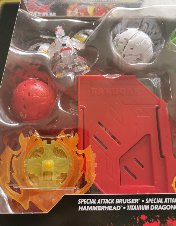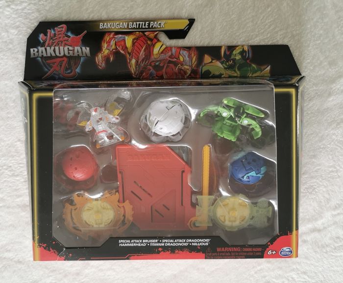 - 1 arène de combat avec zones d'exposition, 1 Bakugan Special Attack Dragonoid, 1 anneau, 1 lanceur, 1 carte Personnage et 1 carte Portail. L'arène mesure plus de 40 cm de long. Prépare ton Bakugan en l'assemblant à l'anneau et au lanceur puis lance-le à toute vitesse pour l'ouvrir grâce à une attaque spéciale. Les billes Bakugan se déploient et se transforment en créatures fabuleuses lorsqu’elles sont envoyées correctement sur les cartes aimantées. Des combats épiques pour les enfants. Chaque Bakugan est aussi un casse-tête miniature : il faut apprendre à maîtriser son mécanisme de fermeture unique. - Bakugan battle pack special attack bruiser et dragonoid : hammerhead, titanium drogonoid, nillious 3 Bakugan + 2 Bakugan Special Attack, 2 anneaux de combat, 1 carte Lanceur, 5 cartes Personnage, 2 cartes Special Attack, 3 cartes de Combat, 2 cartes Portail et une règle de combat. Prépare ton Bakugan en l'assemblant à l'anneau et au lanceur puis lance-le à toute vitesse pour l'ouvrir grâce à une attaque spéciale. #stephanie89240jouet lotb4