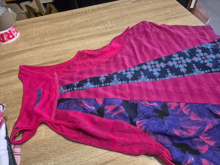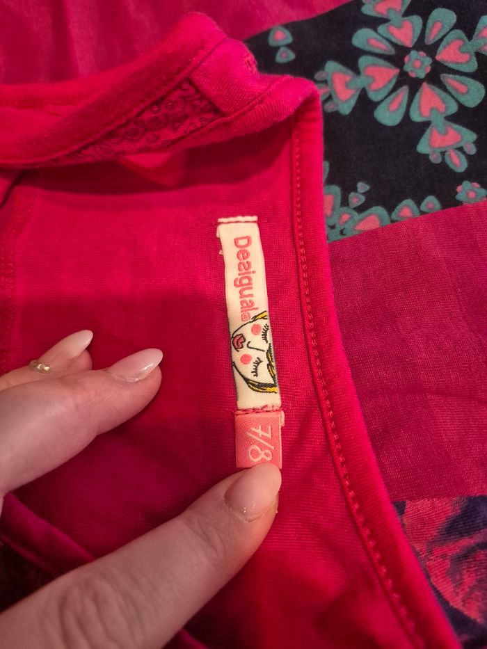 Robe desigual en 7/8 ans Peut ce régler sur les côte avec des boutons Un gilet peu etre mis sur les épaules avec des boutons les emplacement y sont voir photos Très peu porté