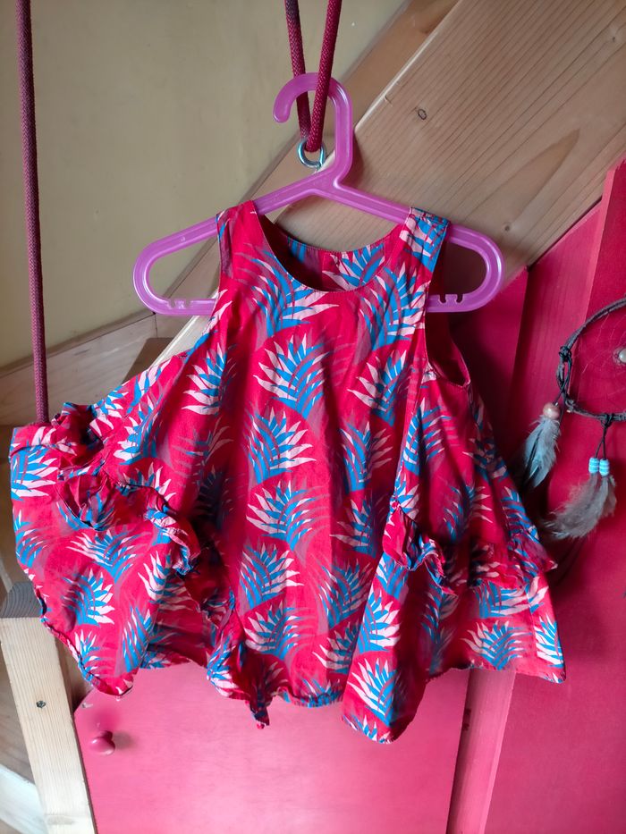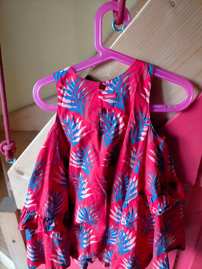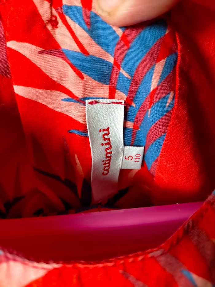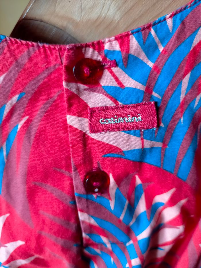 TBE Très jolie robe sans manche coupe évasée en cotonnade rouge imprimé de feuillage bleu. Boutons et étiquette catimini au dos. Aussi belle portée que confortable lorsqu'il fait très chaud