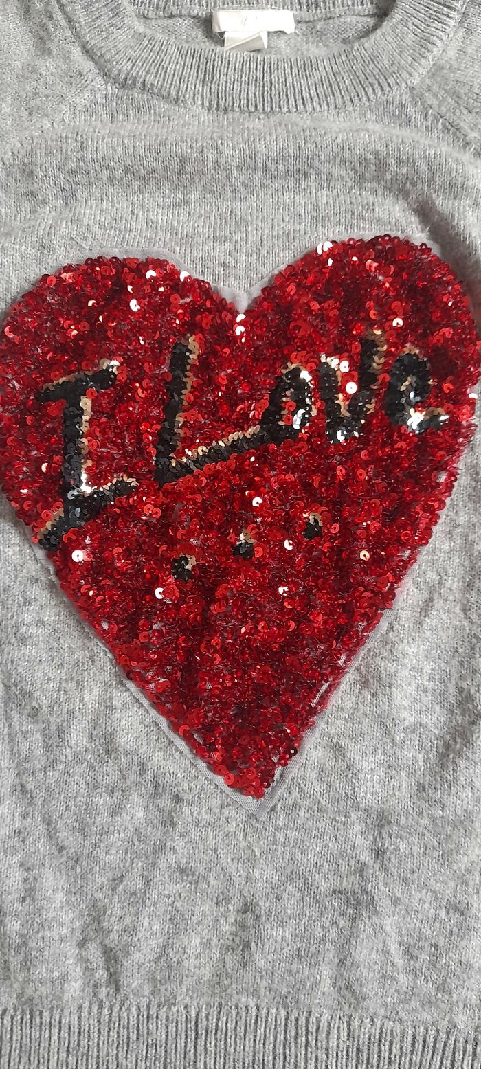 Neuf. Maille douce et chaude griq chiné, coeur rouge en strass. Taille M