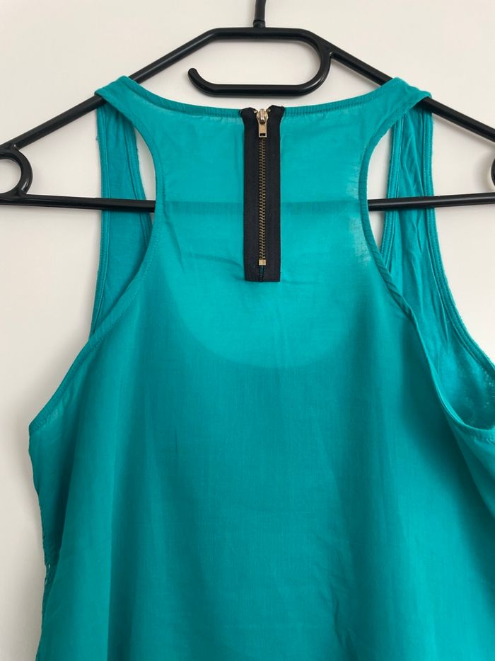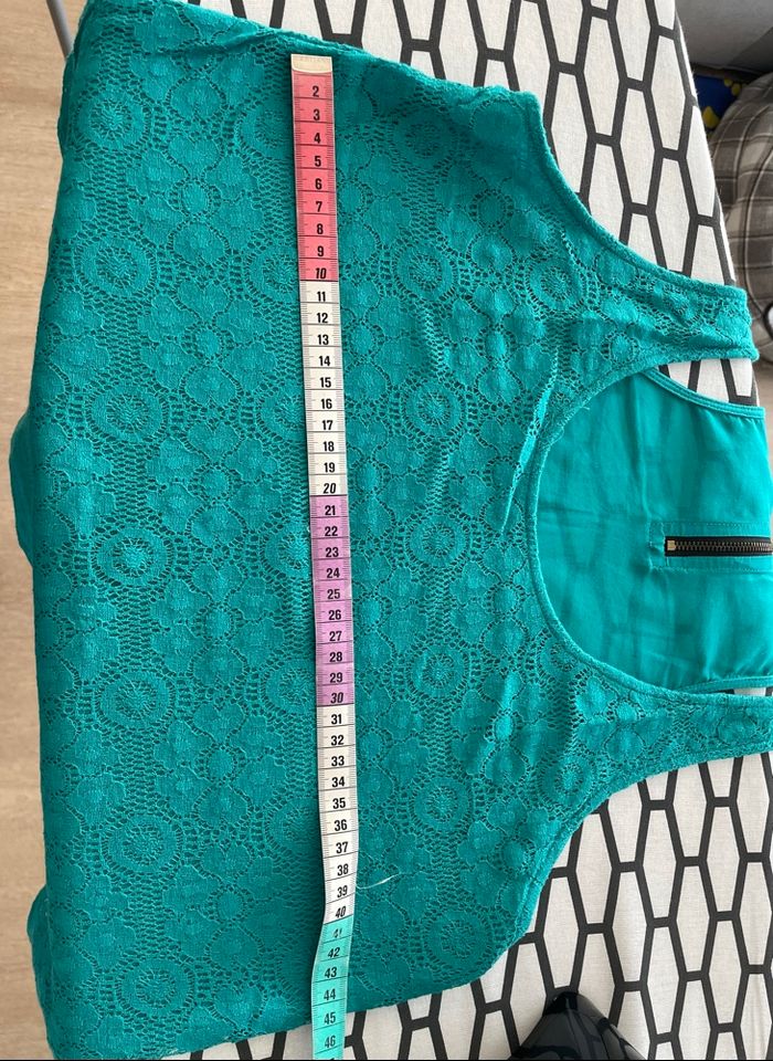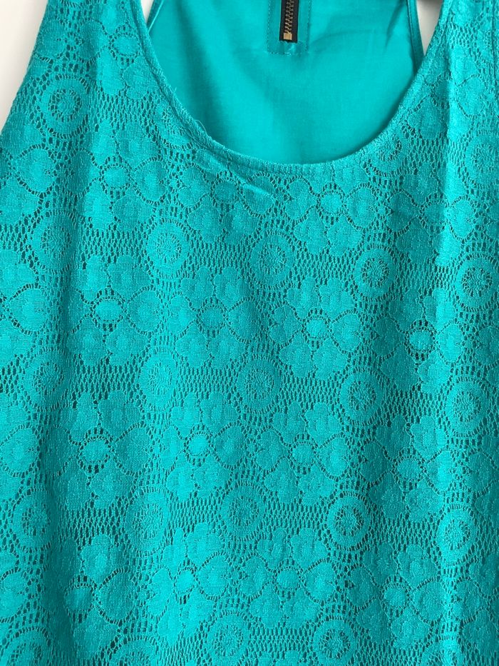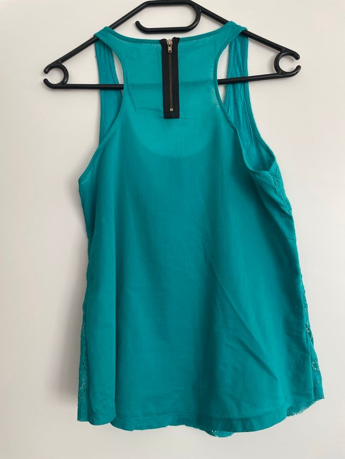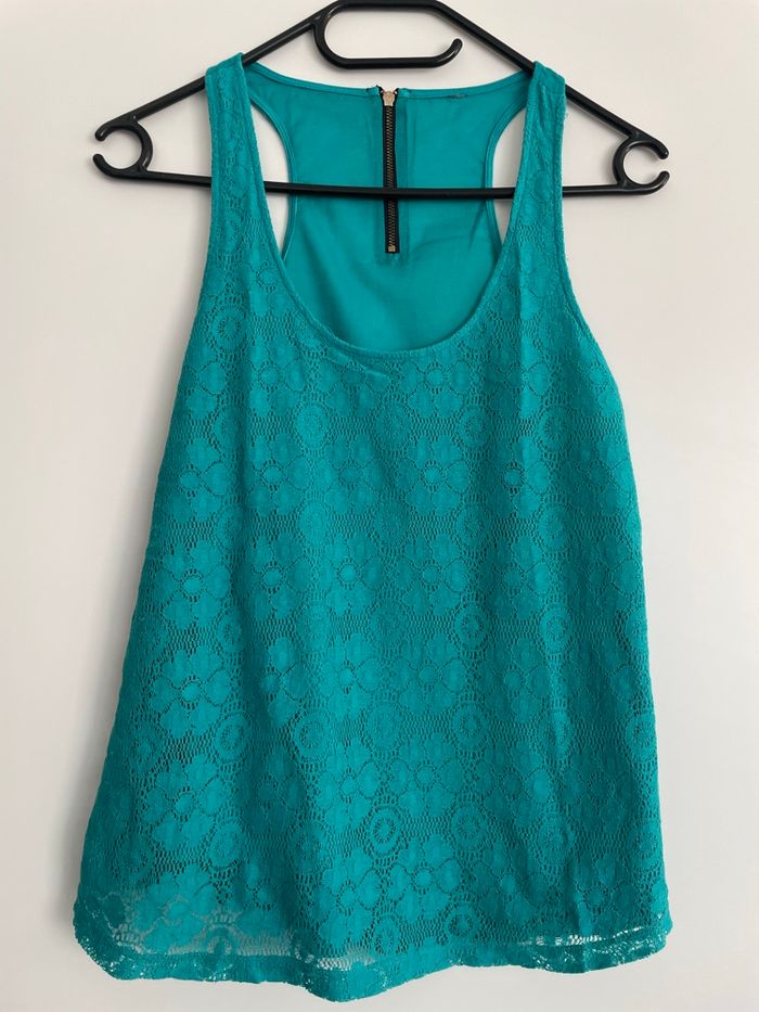 À vendre un top dos nu bleu turquoise avec dentelle à l'avant et fermeture éclair dans le dos Décolleté rond Acheté chez Pimkie mais l'étiquette a été coupée Taille S (voir mesures sur les photos)