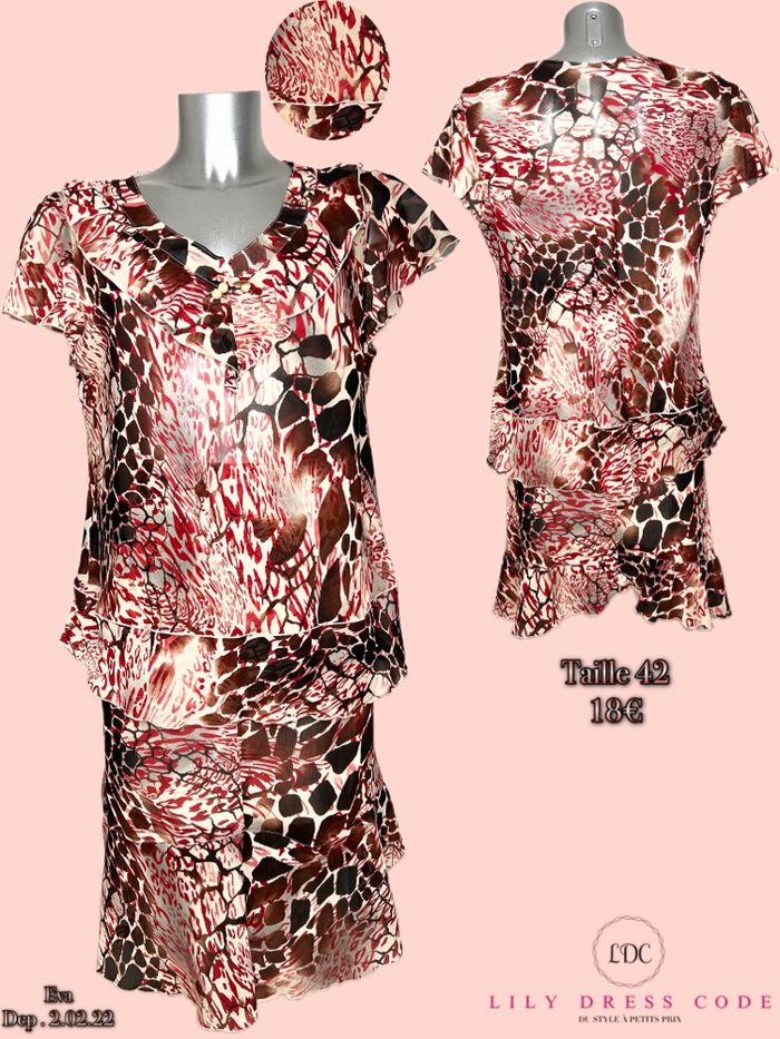 ❤️ ENSEMBLE IMPRIMÉ ROUGE & MARRON VOLANTÉ – MARQUE NON PRÉCISÉE – TAILLE 42 – SOLDÉ -90% ❤️