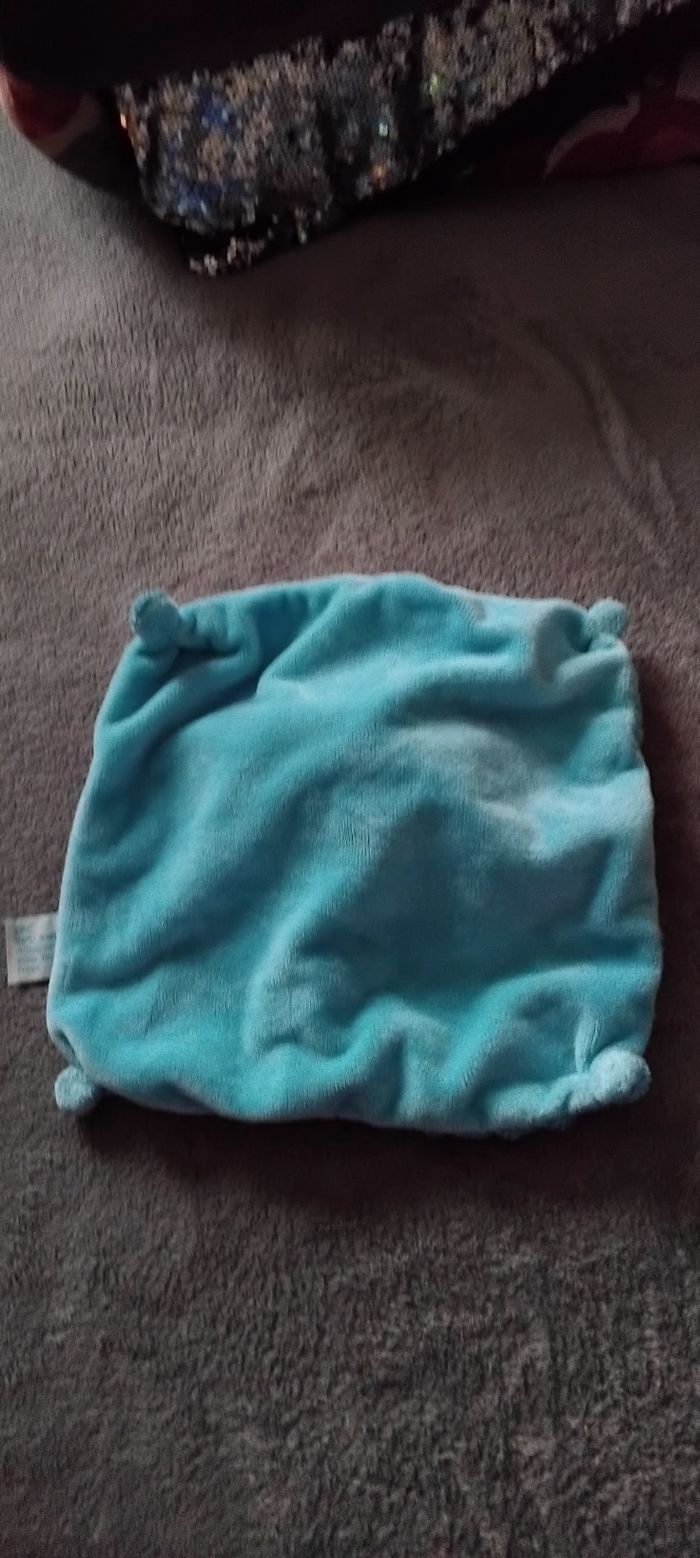 Doudou carré plat en velour de couleur bleu lagon et en velours côtelé Chien en velours côtelé de couleur bleu turquoise sur le milieu du doudou Nez de couleur vert pomme Nœud dans chaque coin