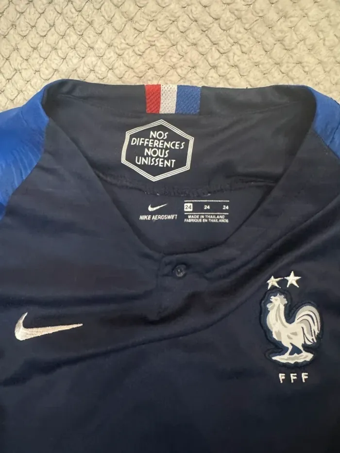 Ensemble officiel Nike – Équipe de France comprenant : ✔️ 1 maillot ✔️ 1 short 👉 Vendus ensemble uniquement 🔹 Taille : enfant 8 ans (équivalent Nike 24 / env. 128 cm) 🔹 Marque : Nike 🔹 Technologie : Nike Aeroswift 🔹 Couleur : bleu marine / bleu 🔹 État : très bon état général ⭐ À noter (important) : • Maillot avec 2 étoiles • Short avec 1 étoile ➡️ Différence de version/saison, 100 % authentique, aucun impact sur l’usage.