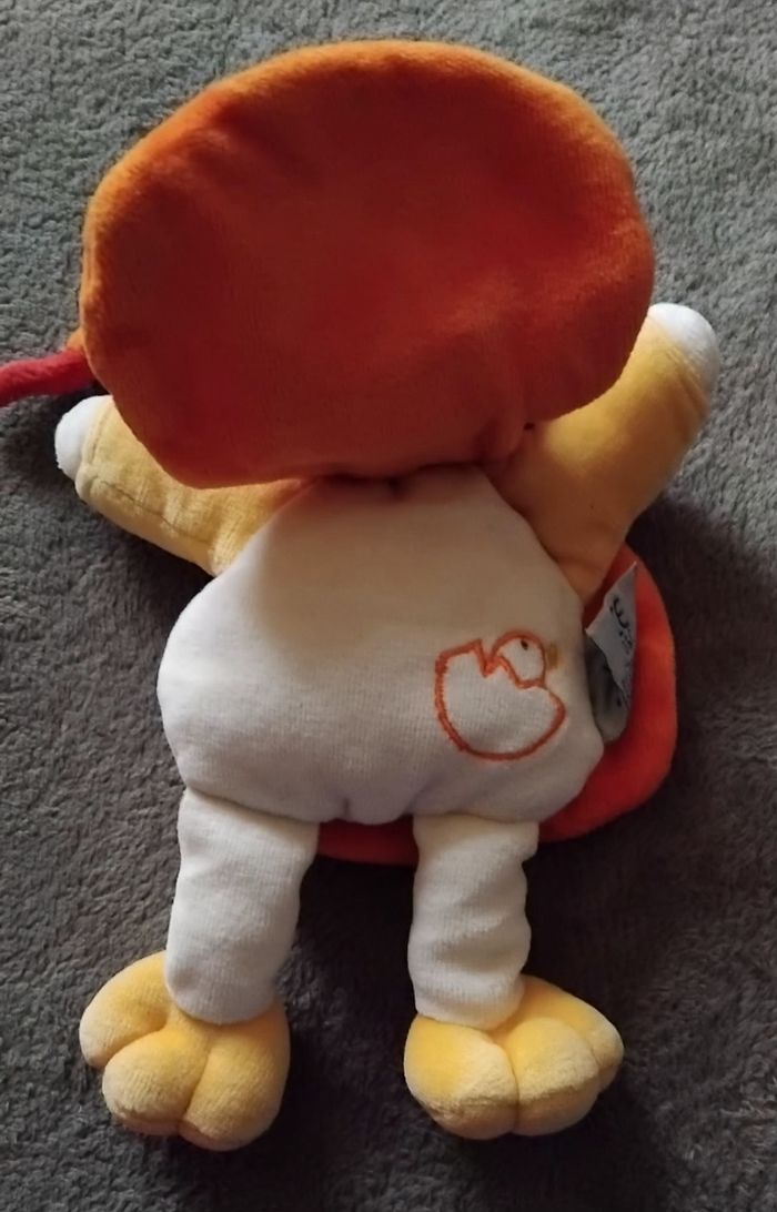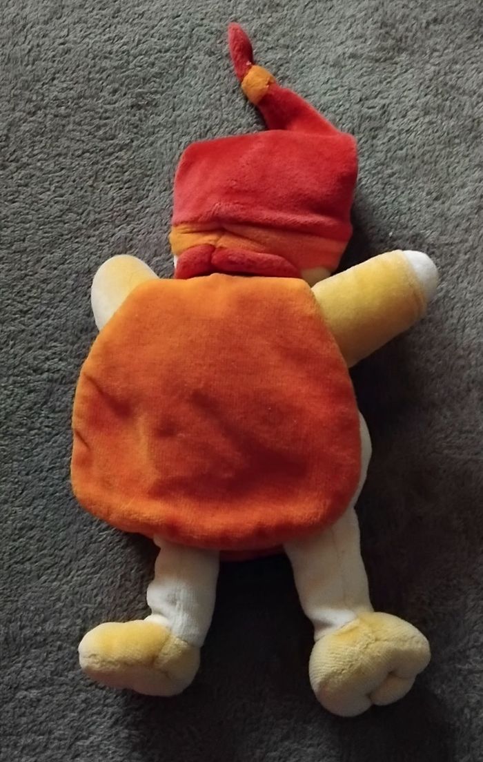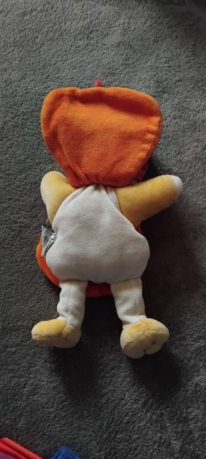 Doudou et compagnie Canard en velours de couleur blanc Capes et bonnet en velours de couleur orange Bras ,bouts des pieds et bec en velours de couleur jaune Œuf dans sa coque sur le milieu du doudou Lever la cape avant pour y découvrir le bébé dans sa coquille