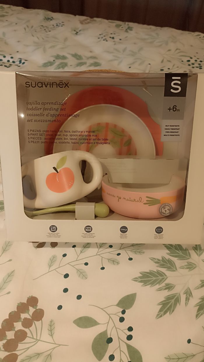 Set de 5 pièces avec assiette plate, bol, tasse, cuillère et set de table. Neuf jamais utilisé
