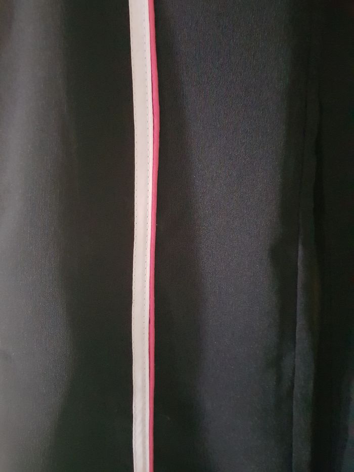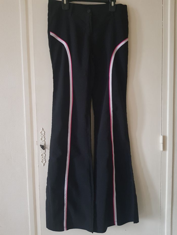 Pantalon noir élégant, coupe évasée, avec bandes contrastées sur les côtés. Style chic et original, facile à porter au quotidien ou pour le travail. 📏 Taille : 42