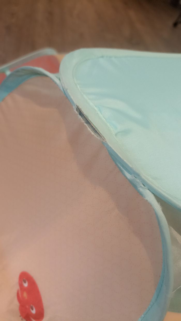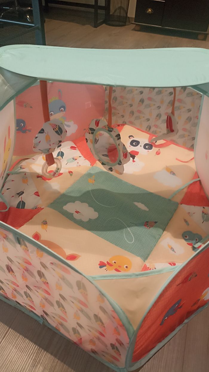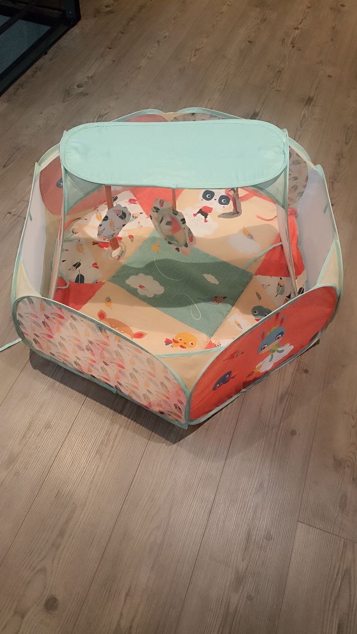 Parc pliable et transportable. Très pratique avec son tapis et arche de jeux. Juste petit point d'usure ( voir photo 3) sinon en très bon état