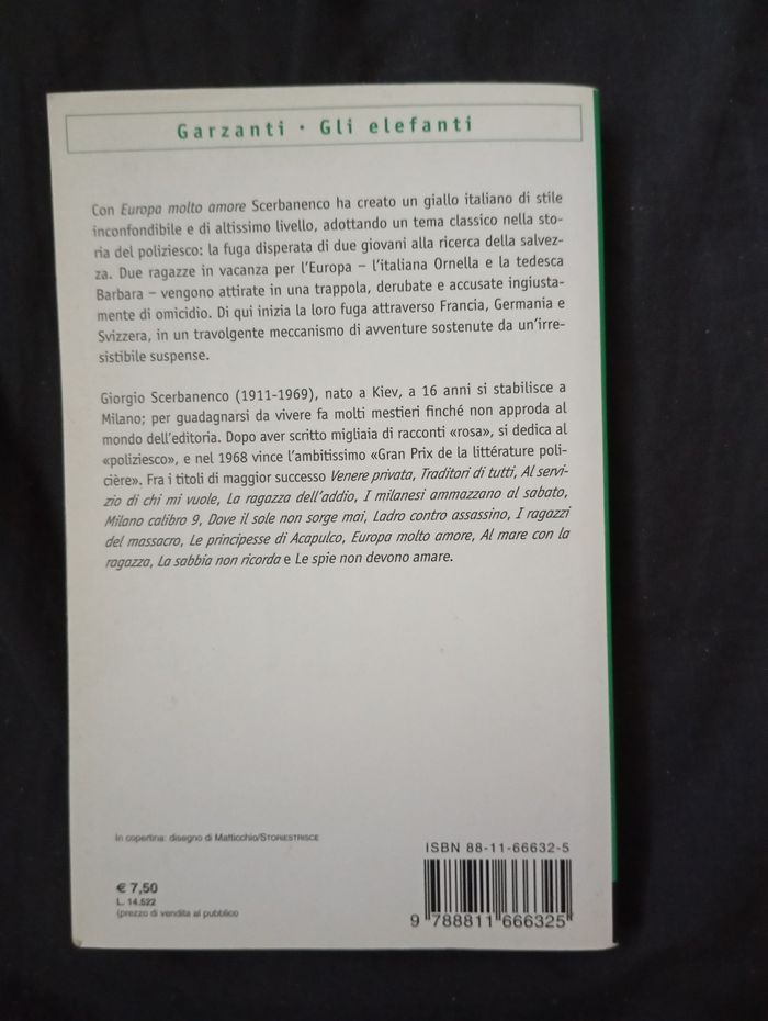 Je vends ce livre "Europa molto amore" de l'auteur italien Giorgio Scerbanenco, édition italienne. - Titre : Europa molto amore - Auteur : Giorgio Scerbanenco - Éditeur : Garzanti - Collection : Gli elefanti - Langue : Italien Très bon état N'hésitez pas à me contacter pour plus d'informations !