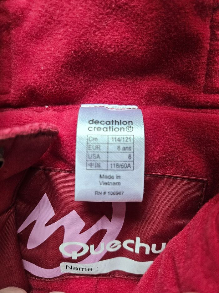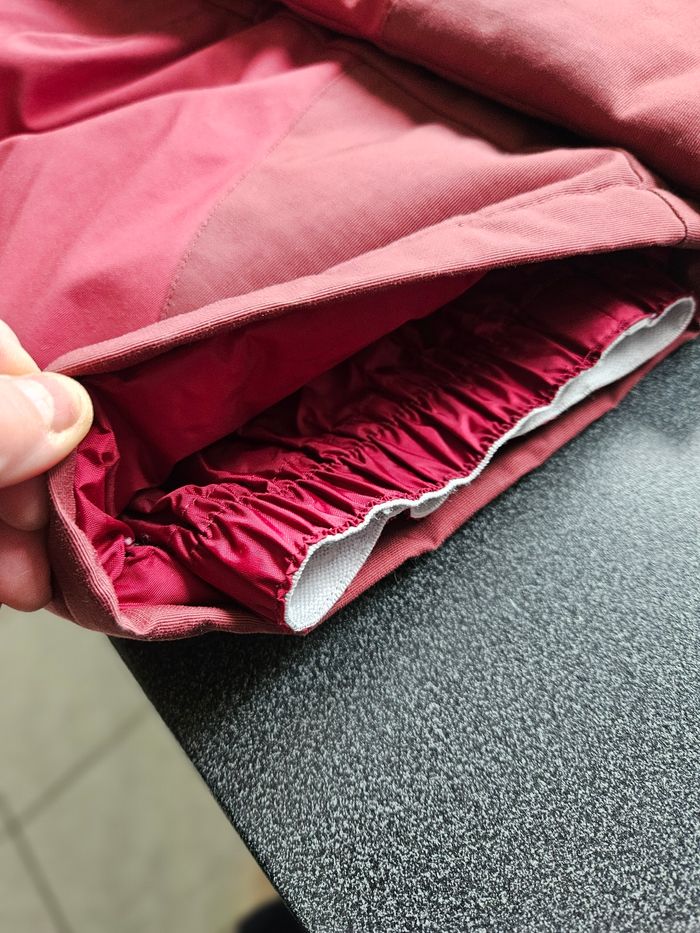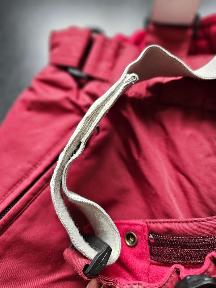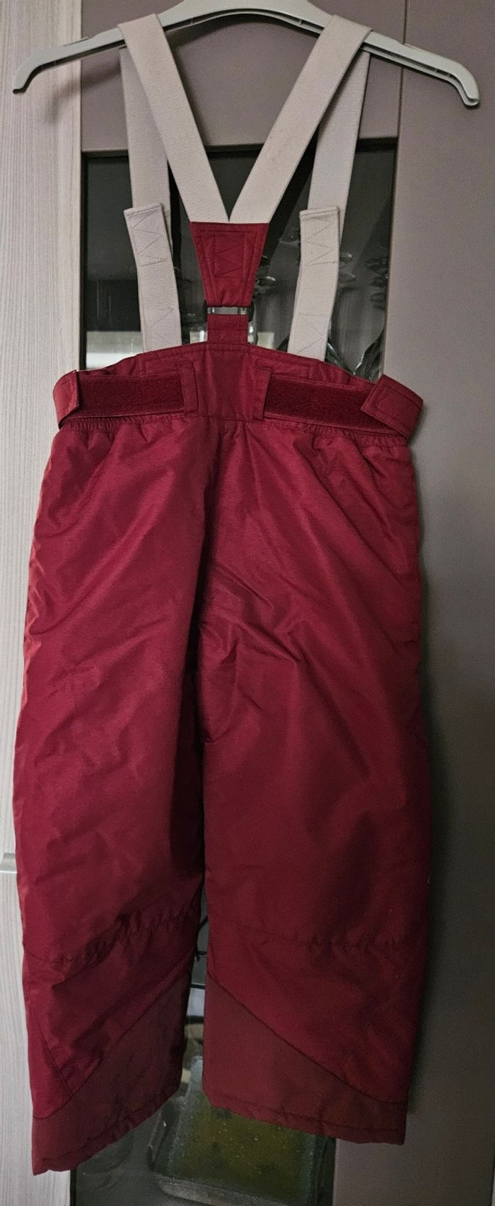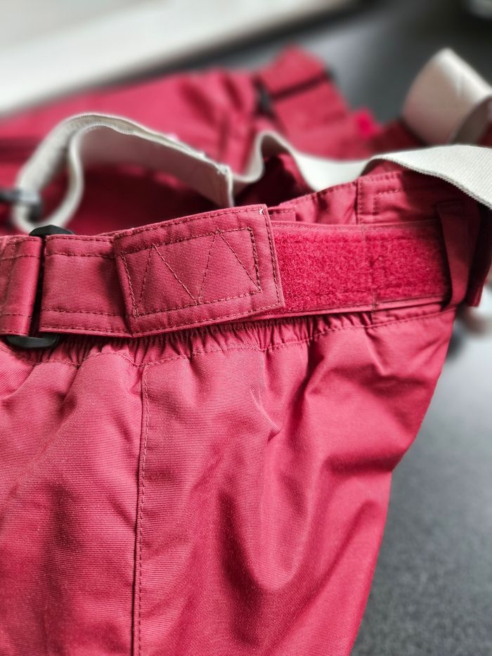 Pantalon de ski couleur bordeaux. Bas de pantalon élastiqué. Taille réglable grâce à des scratchs, bretelles réglables aussi. Tâche très peu visible comme sur la dernière photo.