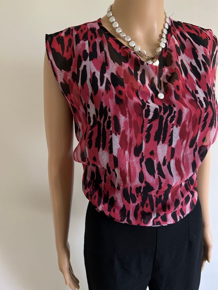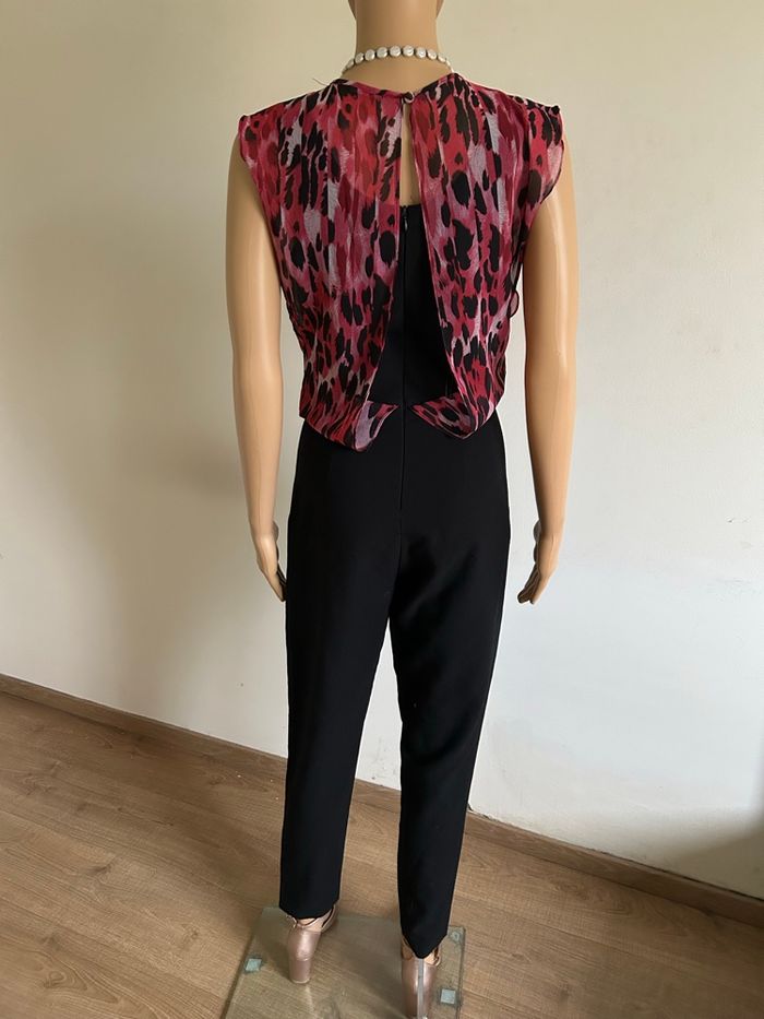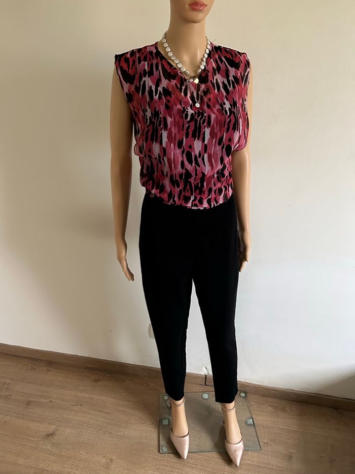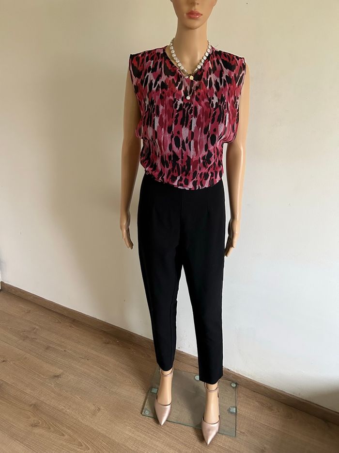 Magnifique combinaison noire et rose sans manches, de marque Guess. Fermeture dans le dos. Correspond à une taille 34 (étiquette de taille coupée, voir mesures en dessous). Portée quelques fois, en très bon état. aisselle à aisselle 42 cms taille 34 cms longueur depuis épaule environ 140 cms Étiquette intérieure de composition coupée