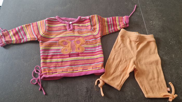 1 ensemble "sucre d'orge" 1 pull a rayures "Kimbaloo " 1 pantacourt "3 pommes 🍎 " En très bon état Taille 6 mois
