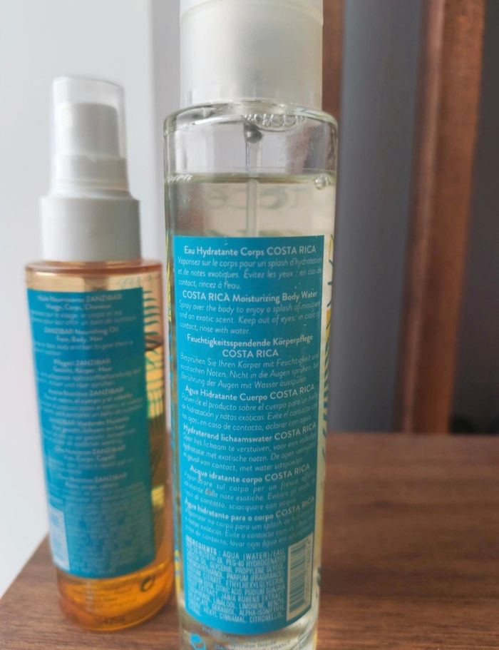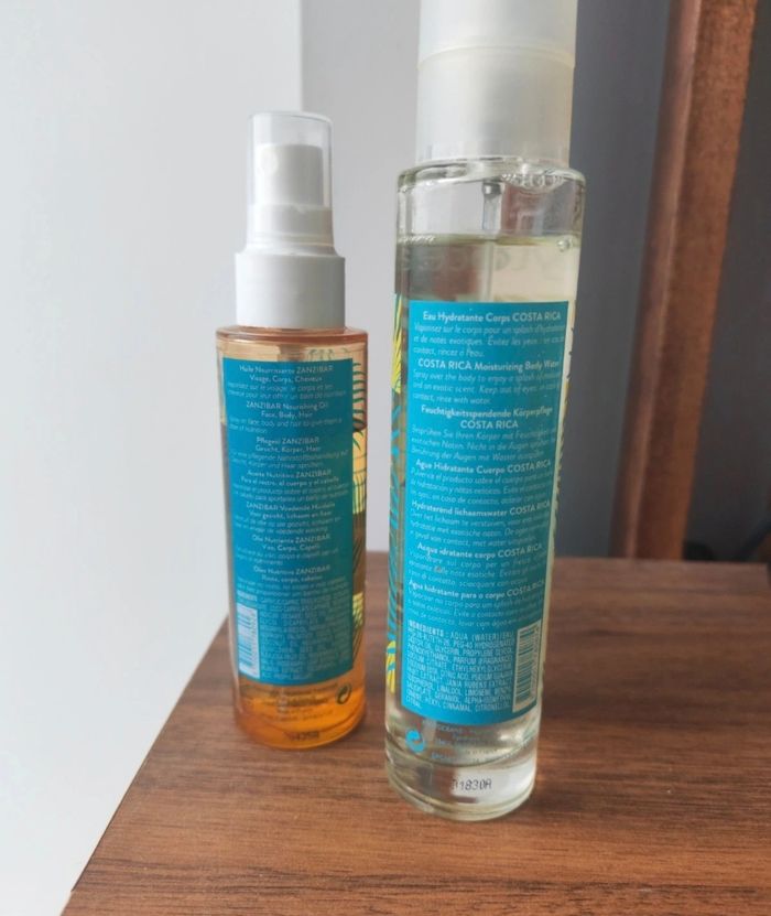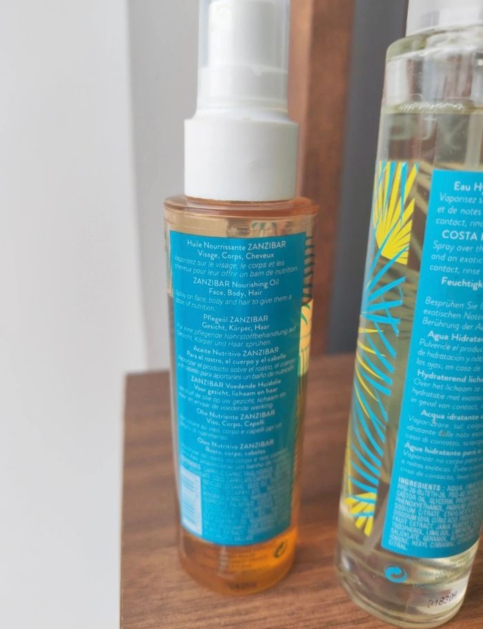 Huile nourrissante Zanzibar composé de 93 % d'ingrédients origine naturelle cette huile sèche associer un trio d'huile végétale : vierge de coco, bio de sésame et macadamia. En un seul geste elle hydrate nourrit et protège le visage le corps et les cheveux sa texture enveloppe la peau d'un parfum exotique Elles sont extrêmement bon ça sent Déjà utilisé niveau du produit voir photos Eau hydratante corps Costa Rica c'est eau fraîche ne contient pas d'alcool hydrate et rafraîchit en un seul geste la peau est enveloppée de notre exotique idéal pour se rafraîchir après la plage ou le sport Elles sont super bon Déjà utilisé niveau du produit voir photos