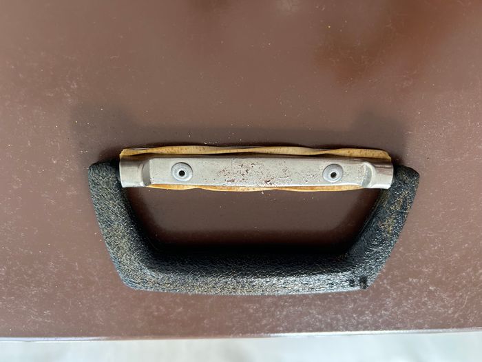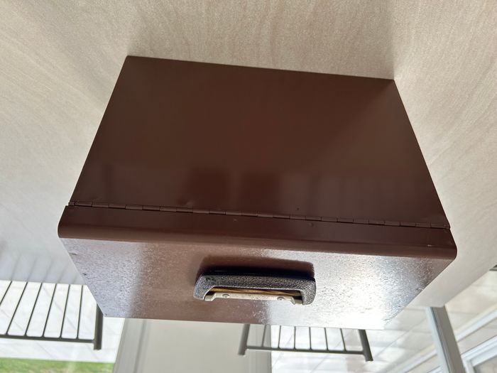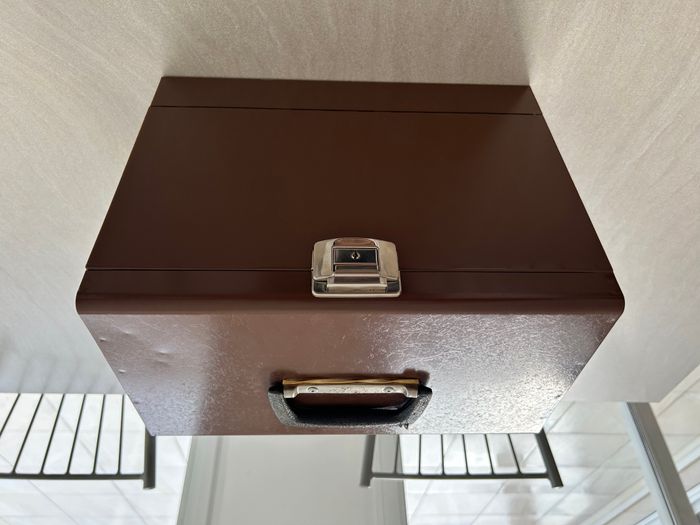 Un coffre de rangement en métal marron , pas de clefs Dimensions: 36 cm de longueur, é& cm de largeur et 27 cm de hauteur