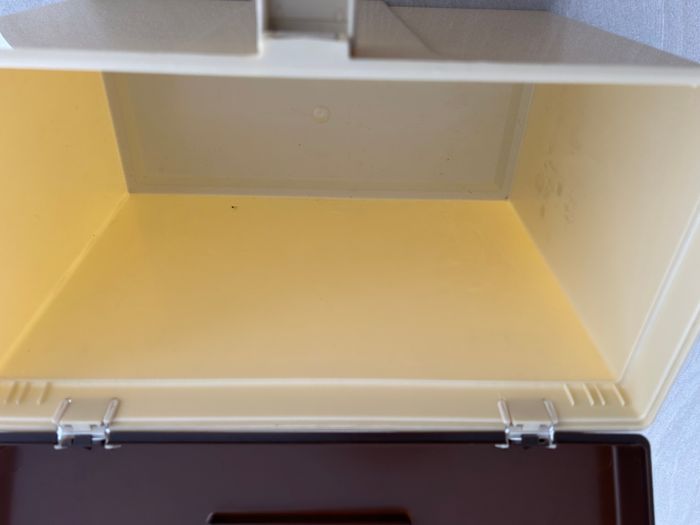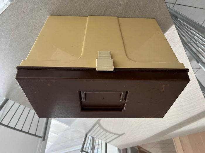Un coffre de rangement en plastique beige et marron de dimensions: Longueur 39 cm, largeur 20,5 cm et hauteur 30 cm