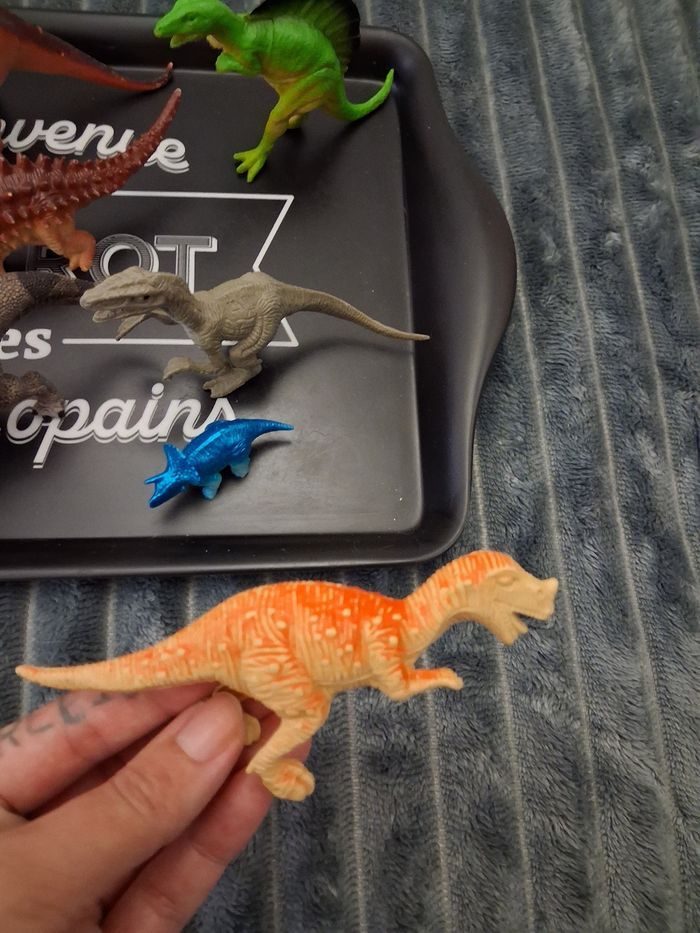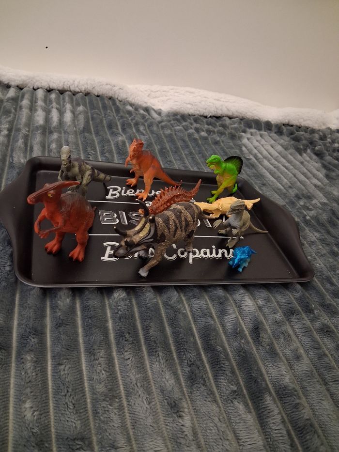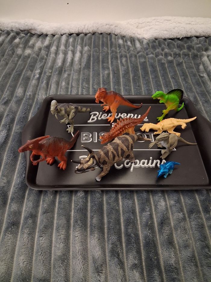 Lot de 9 petits dinosaures en très bon état (seulement 1 d'entre eux est en plastique (cf dernière photo), les autres sont en matière bien plus rigide), sans marque N'hésitez pas à me contacter si vous avez des questions 😀