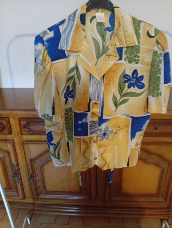 Chemisier manche court avec un petit nœud derrière . 100 % polyester taille 46 .tout neuf...sans marque 62 cm aisselle a aisselle 62 cm de long couleur .MULTICOLORE .. ⚠️Pas de photo portées⚠️