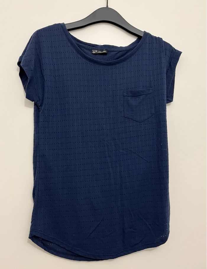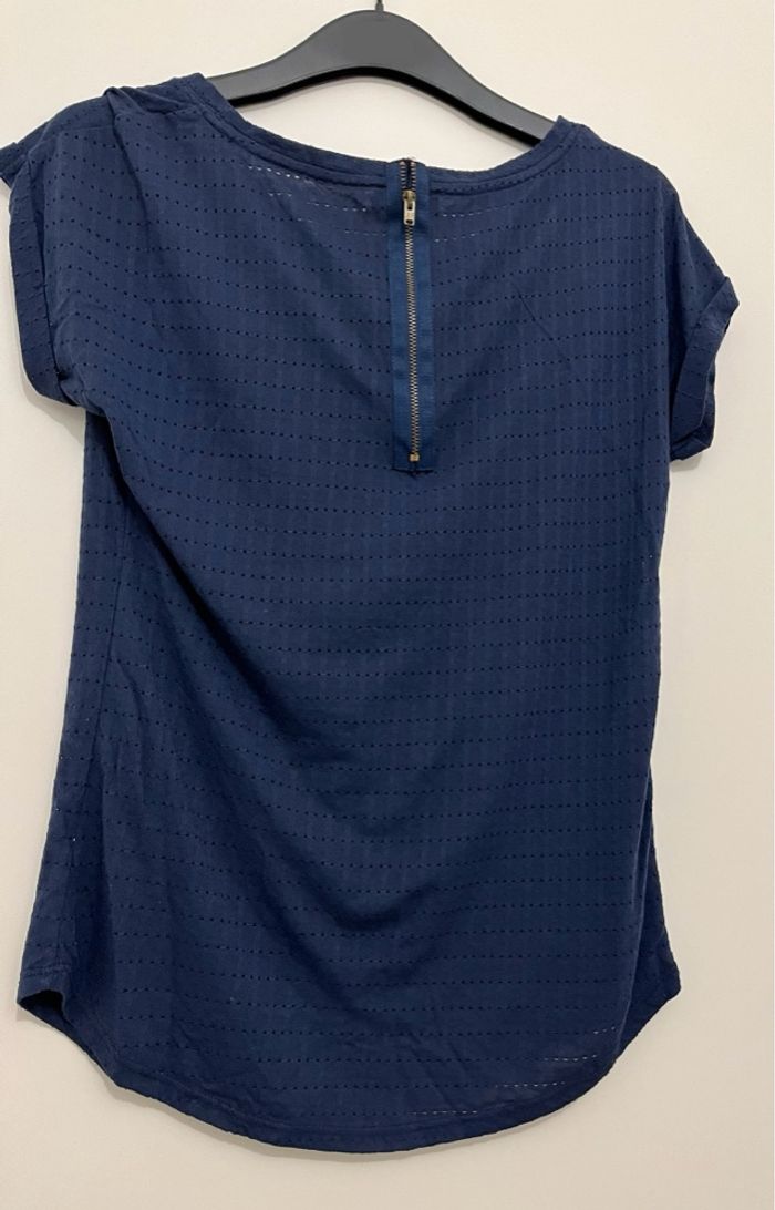 Teeshirt de marque PIMKIE Légèrement ajouré, avec fermeture éclair à l’arrière et poche sur l’avant Manches courte, col rond Taille S Couleur: bleu, bleu roi, marine En parfait état