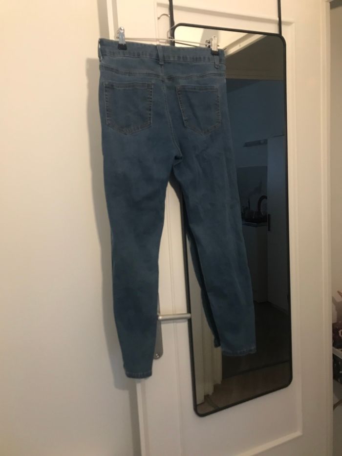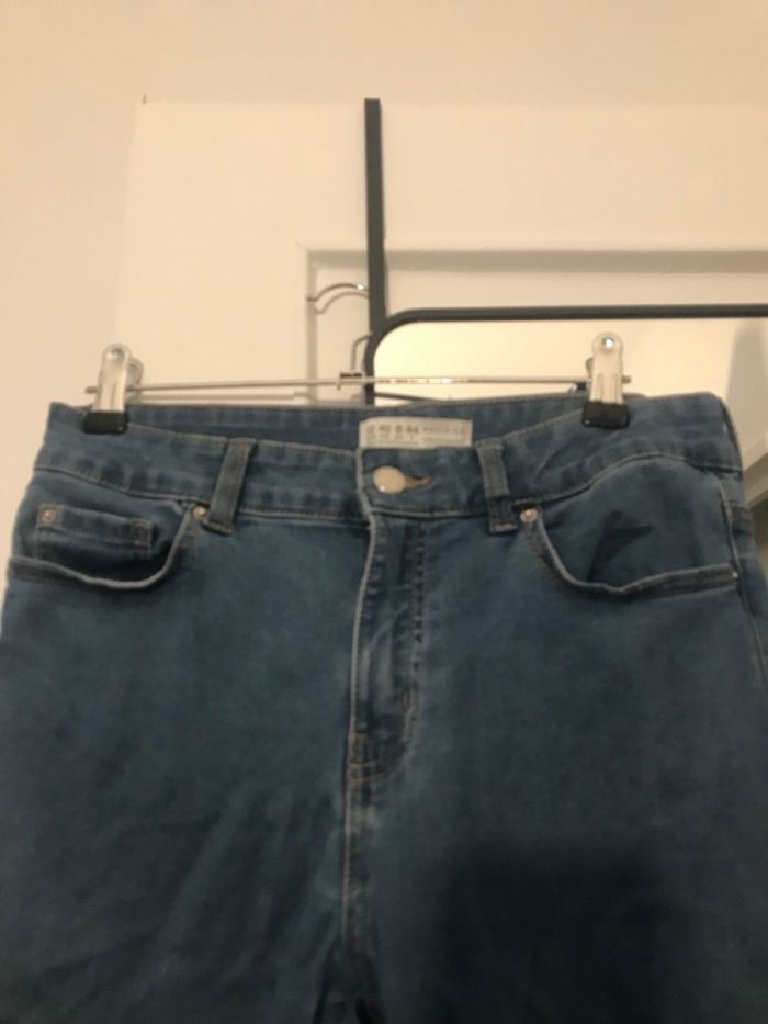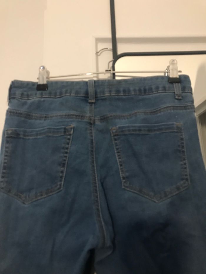 Jean pour femme taille 40 couleur bleu marine matière en coton tee short veste chaussures